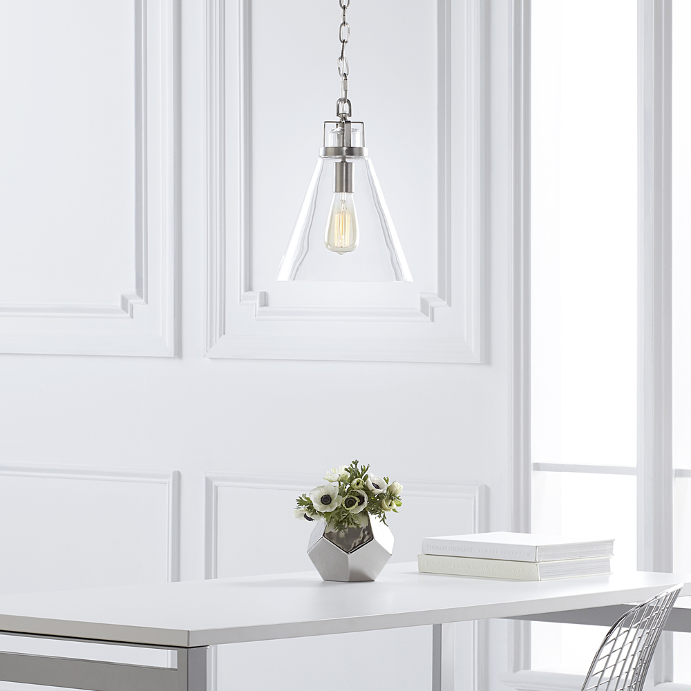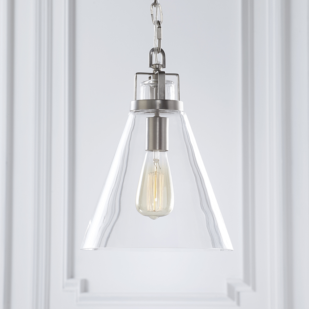The Sean Lavin Frontage, one light pendant in oil-rubbed bronze, is the perfect way to achieve your home's desired fashion or functional needs. The modern Frontage pendant light collection by Sean Lavin is an updated interpretation of a vintage warehouse fixture. In conical silhouettes, the hand-blown Opal Etched glass or Pressed Clear glass shades to create a dramatic contrast to the industrial frame detail which crowns each pendant. When Edison-style lamps are selected, they reinforce the vintage reference while giving the fixtures a dramatic and contemporary flair. These 1-light pendants are available with either Oil Rubbed Bronze or Satin Nickel finishes.