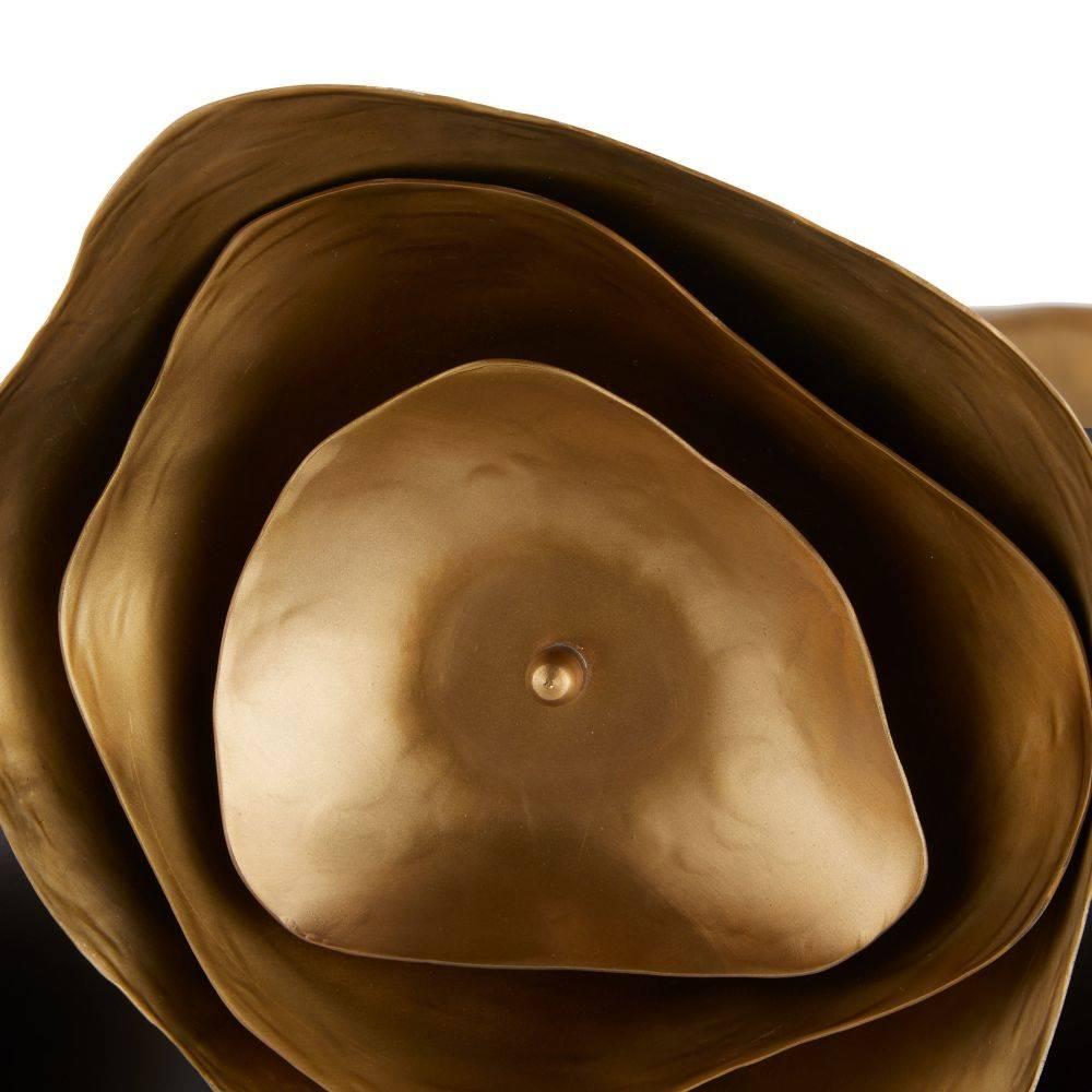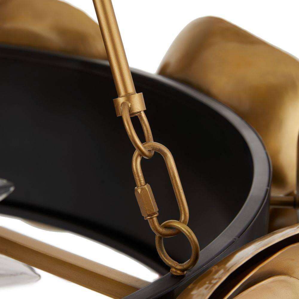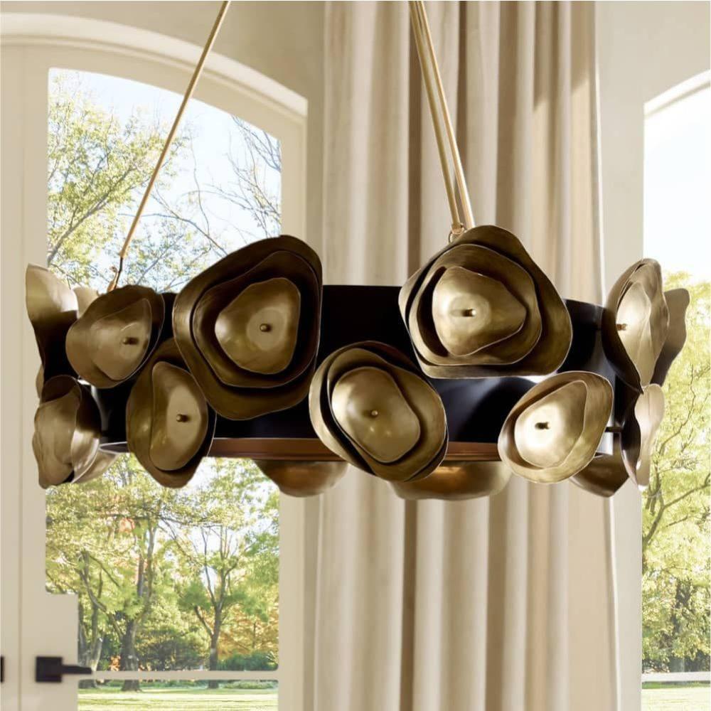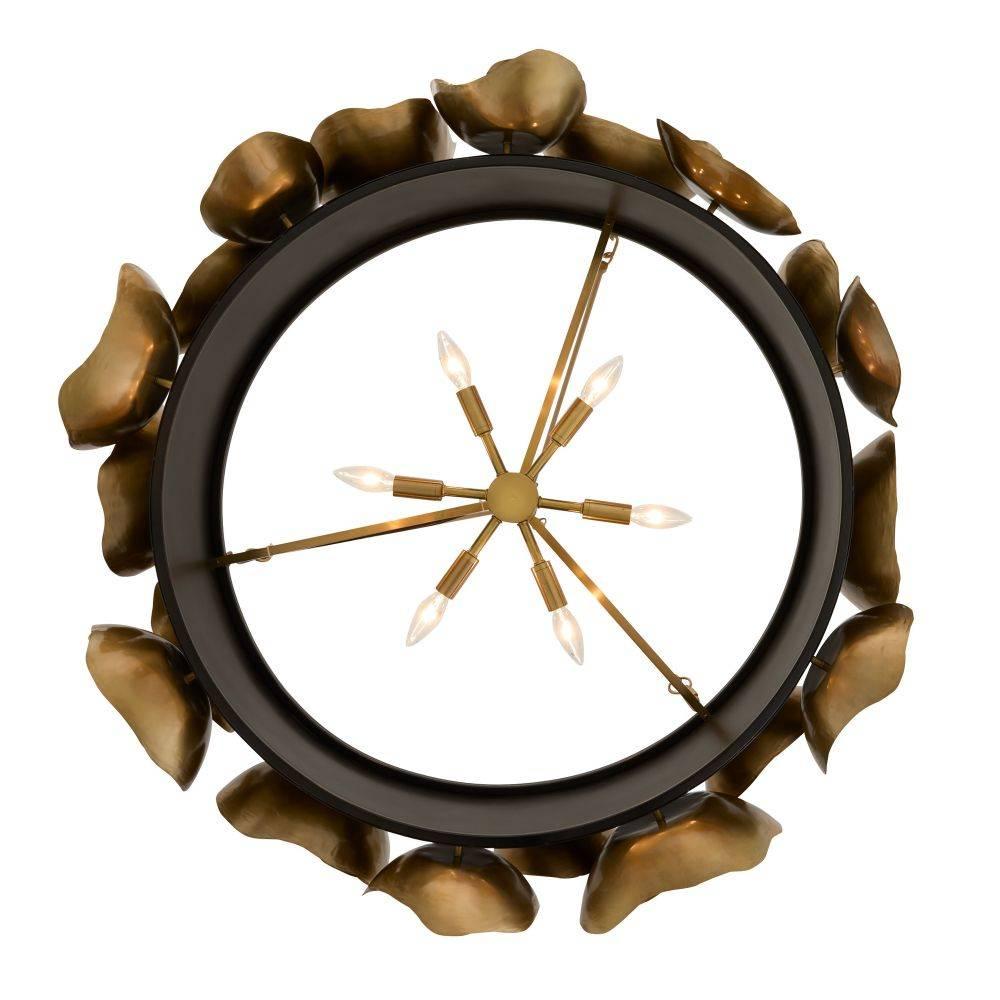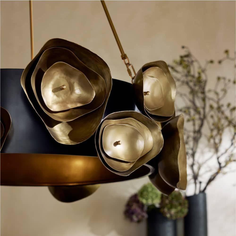 Like the rings found in a natural agate stone, hand-formed accents of antique brass-plated aluminum add depth and interest to this dramatic fixture. Adorning a bronze-plated steel drum shade, the bold motifs hint at botanical abstraction while delivering moody, ambient light. Damp-rated, although limited covered outdoor areas may affect finish. Finish will vary.