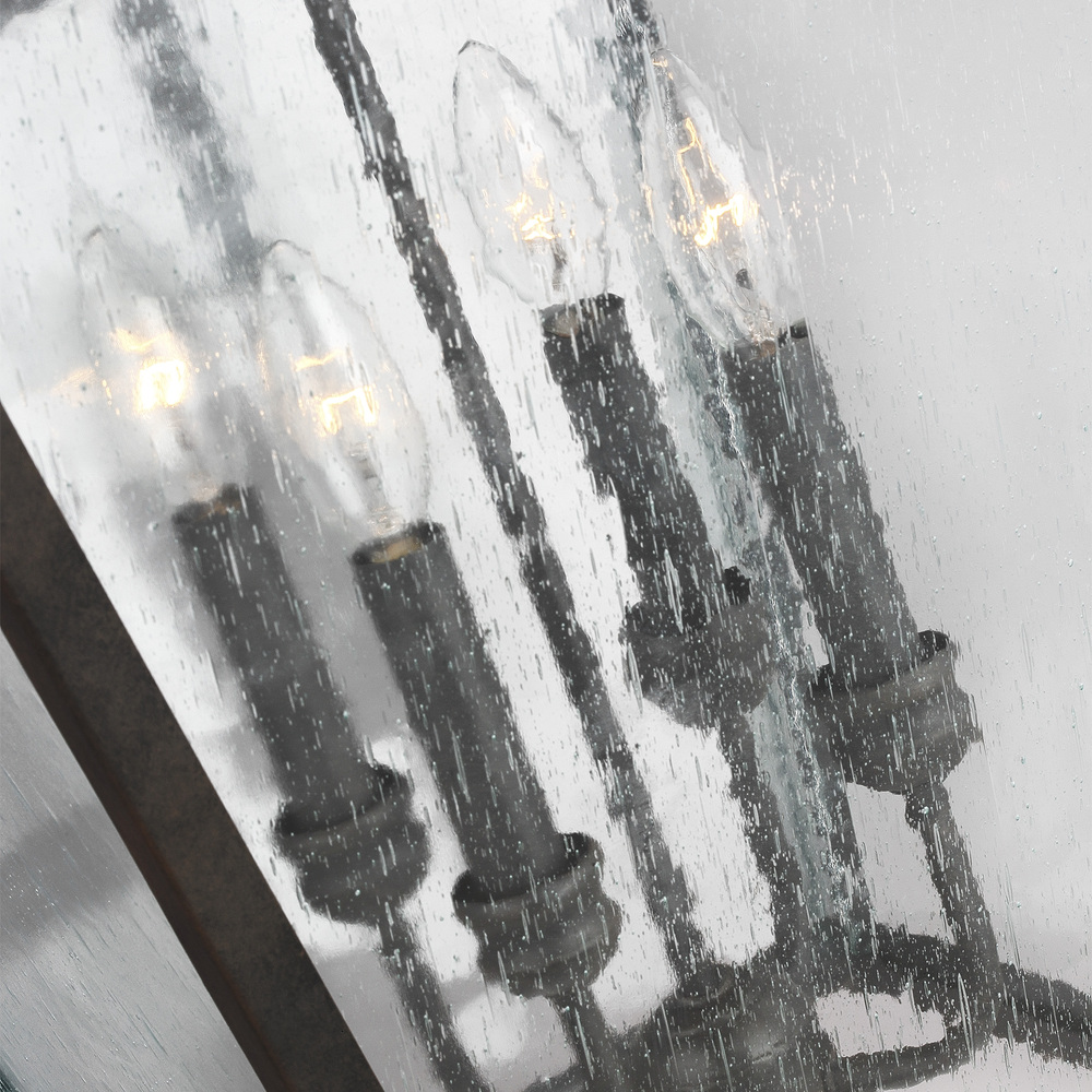 The Sean Lavin Galena four light outdoor wall fixture in sable creates a warm and inviting welcome presentation for your home's exterior. Galena is a Europe-inspired classic lantern. Simple and refined, Galena features a gently curved hook detail atop a vented, square-off roofline, and candle tubes floating within the tapered clear glass shades. Galena is a warm, welcoming silhouette offered in our NEW Sable finish.
