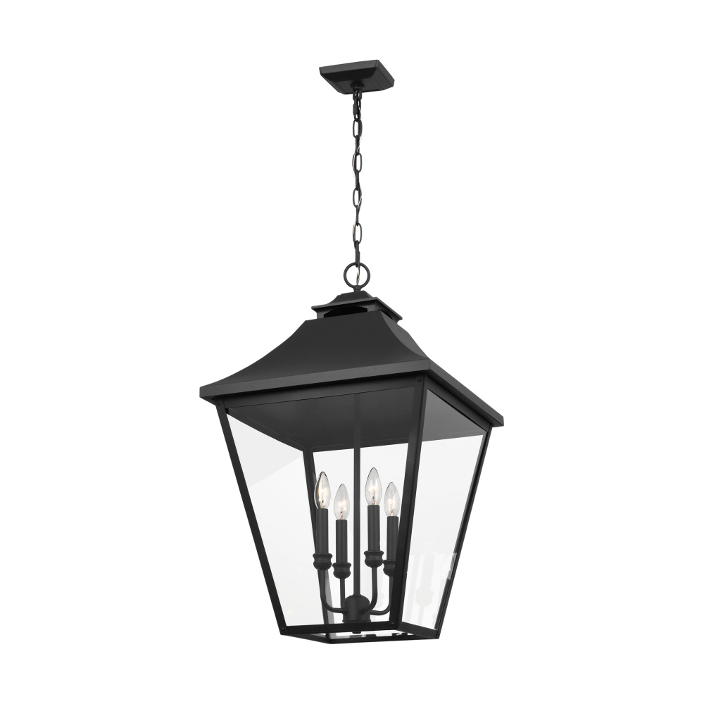Designed by Sean Lavin, the Galena four-light outdoor pendant fixture in textured black enhances the beauty of your property, makes your home safer and more secure, and increases the number of pleasurable hours you spend outdoors. Galena is a Europe-inspired classic lantern. Simple and refined, Galena features a gently curved hook detail atop a vented, square-off roofline and candle tubes floating within the tapered clear glass shades. Galena is a warm, welcoming silhouette offered in a Sable or Textured Black finish.