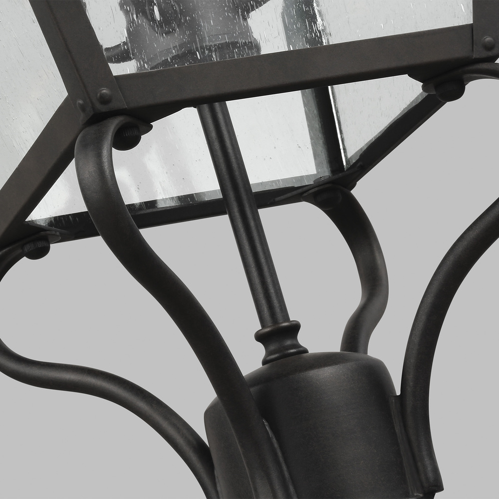 The Sean Lavin Galena four light outdoor post top in sable creates a warm and inviting welcome presentation for your home's exterior. Galena is a Europe-inspired classic lantern. Simple and refined, Galena features a gently curved hook detail atop a vented, square-off roofline, and candle tubes floating within the tapered clear glass shades. Galena is a warm, welcoming silhouette offered in our NEW Sable finish.