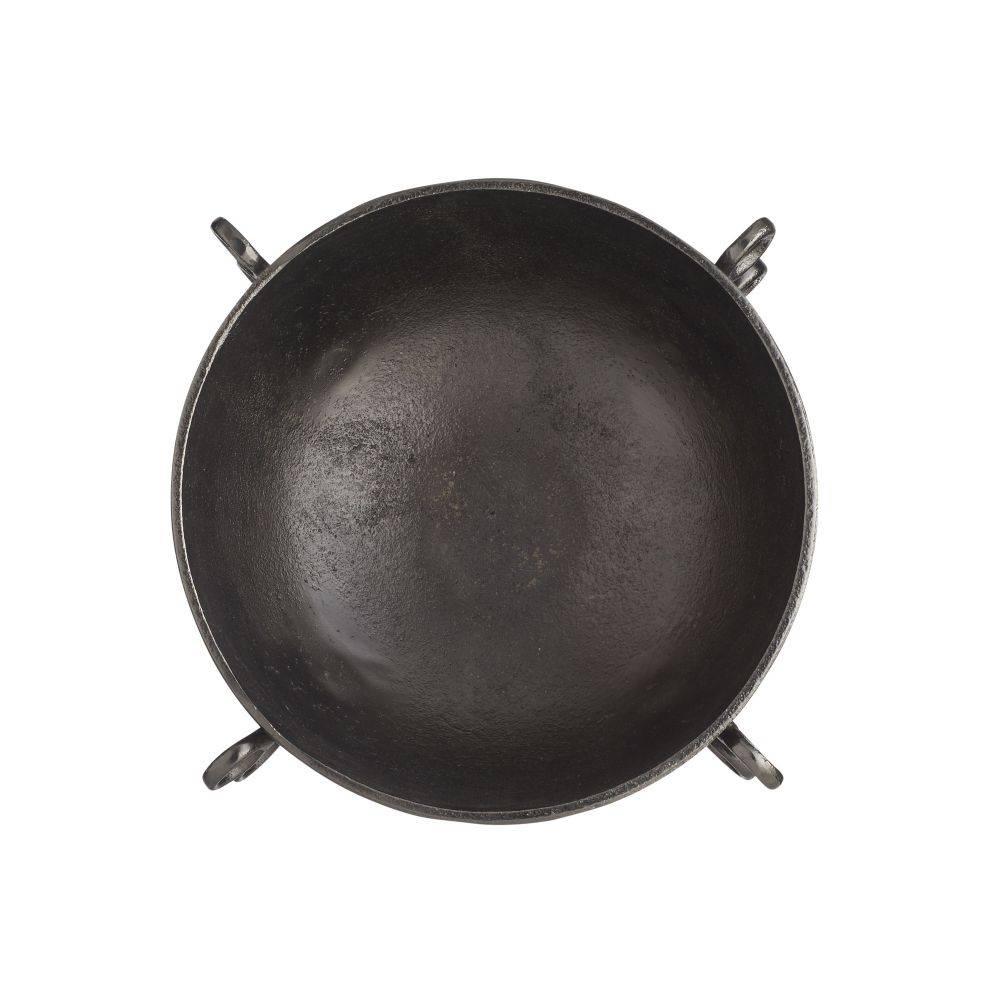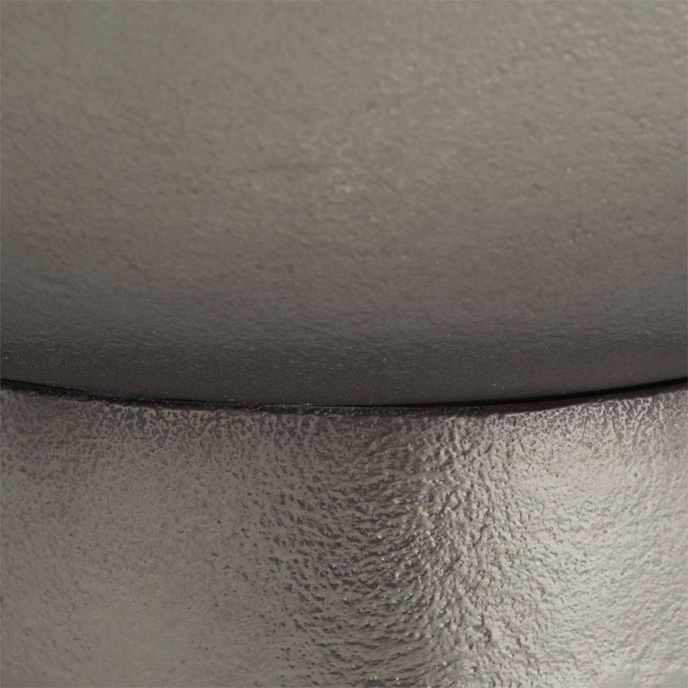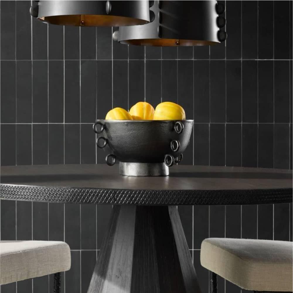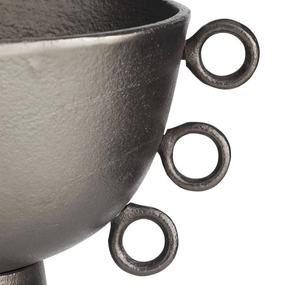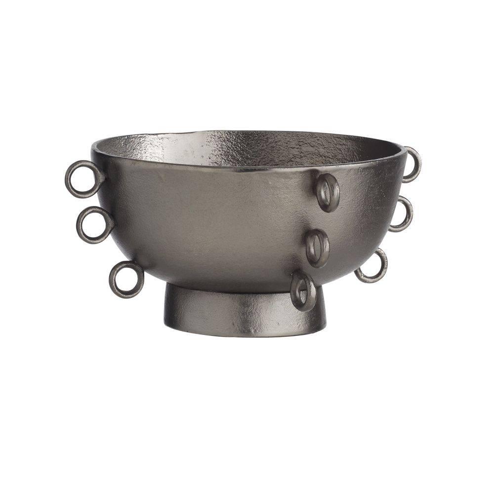 Whimsical loops along each quarter of this stunning bowl add both graphic appeal and easy portability. Cast of aluminum, finished in a graphite finish, it makes a tailored and versatile centerpiece.