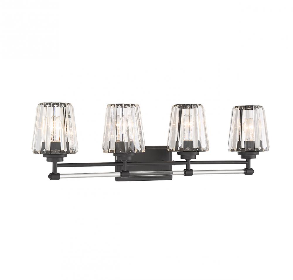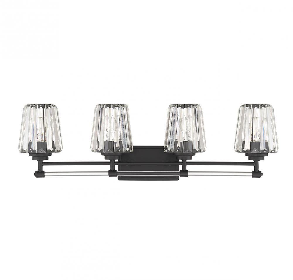 Take the glam factor of your bathroom up a notch with the Savoy House Garnet 4-light bath vanity light! Slats of faceted clear crystal add shimmer while the crystal tube detailing on the arms brings even more shine. Finished in matte black. Garnet is 9.5" in height, 32" in width and extends 7" from the wall. Uses 4 standard size bulbs of up to 60 watts per bulb (bulbs not included).