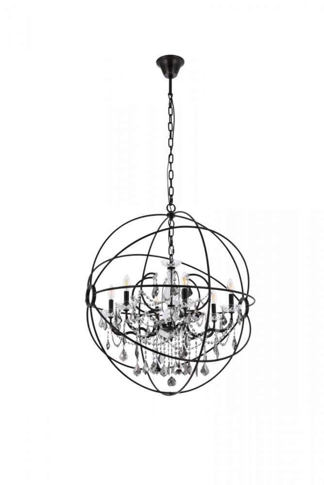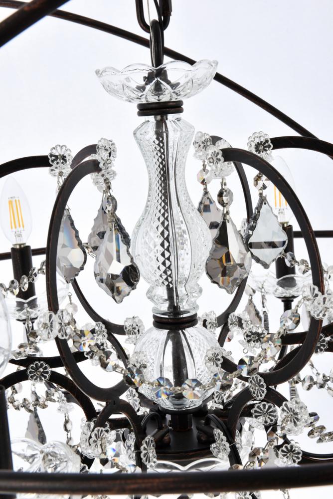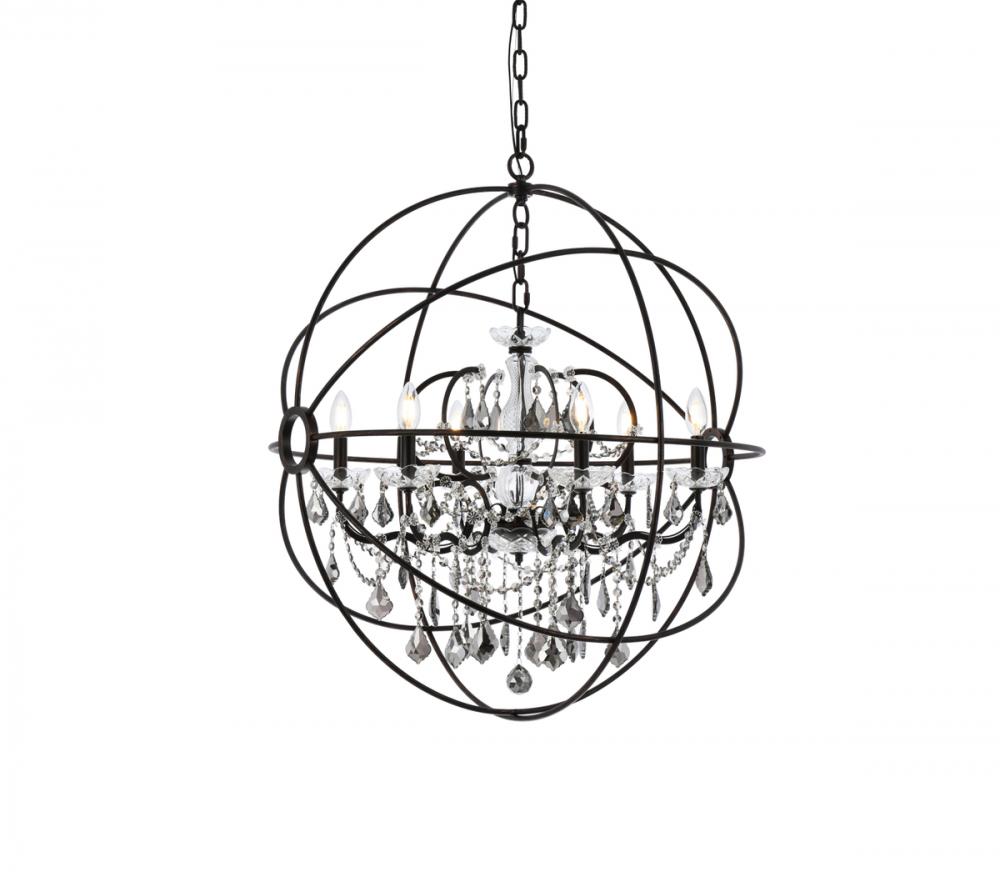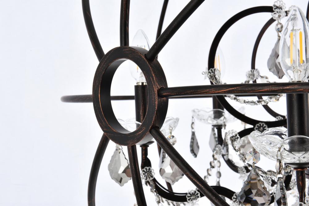 Royal-cut silver-shade crystals and six candelabras beautifully complement the dark-bronze finish