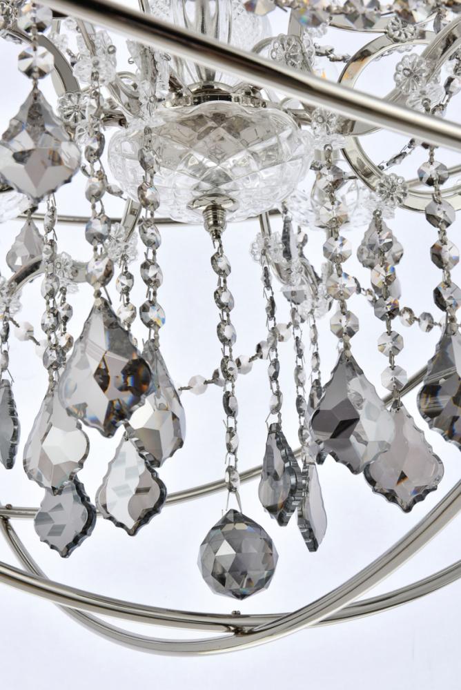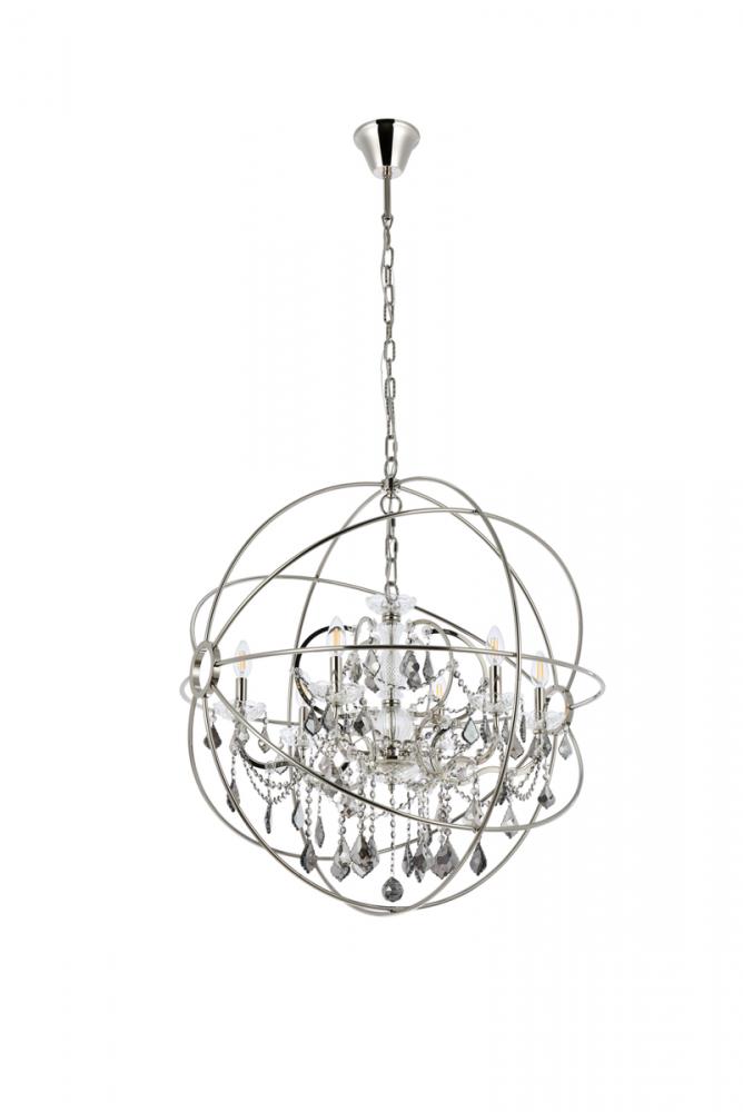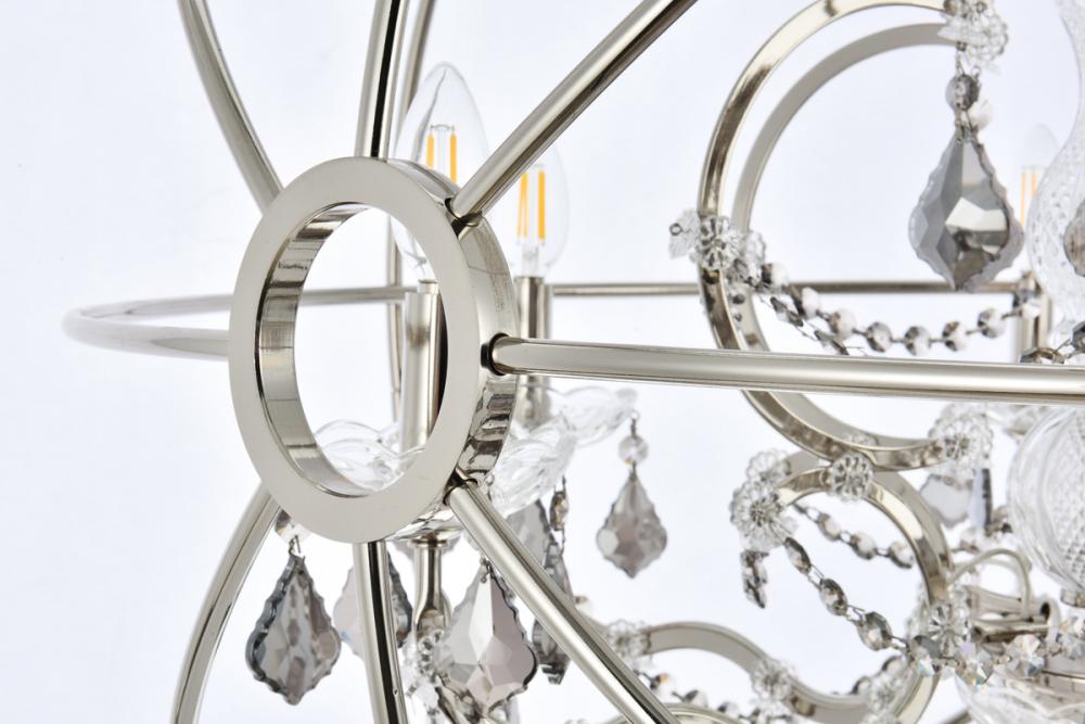 Royal-cut silver-shade crystals and six candelabras beautifully complement the polished-nickel finish