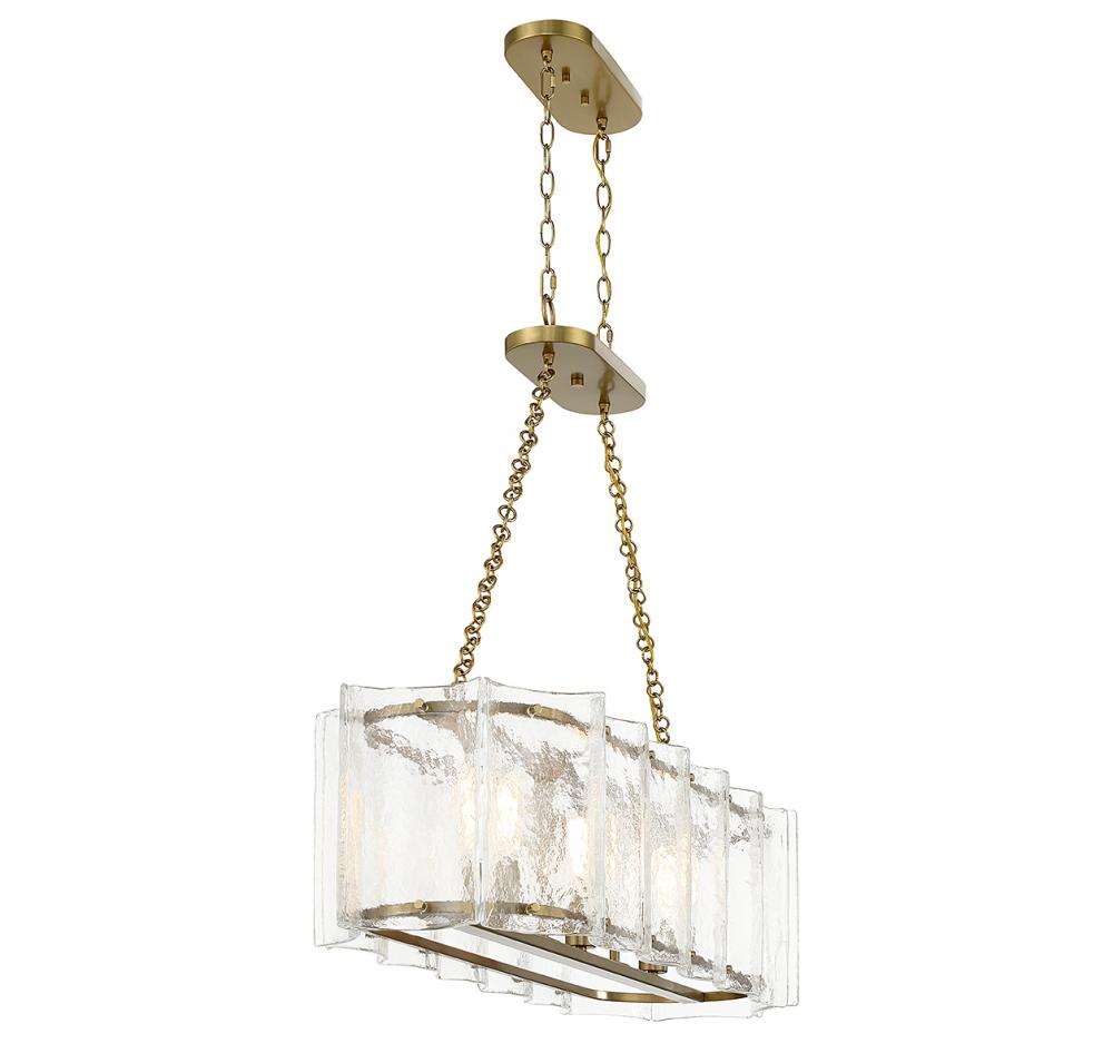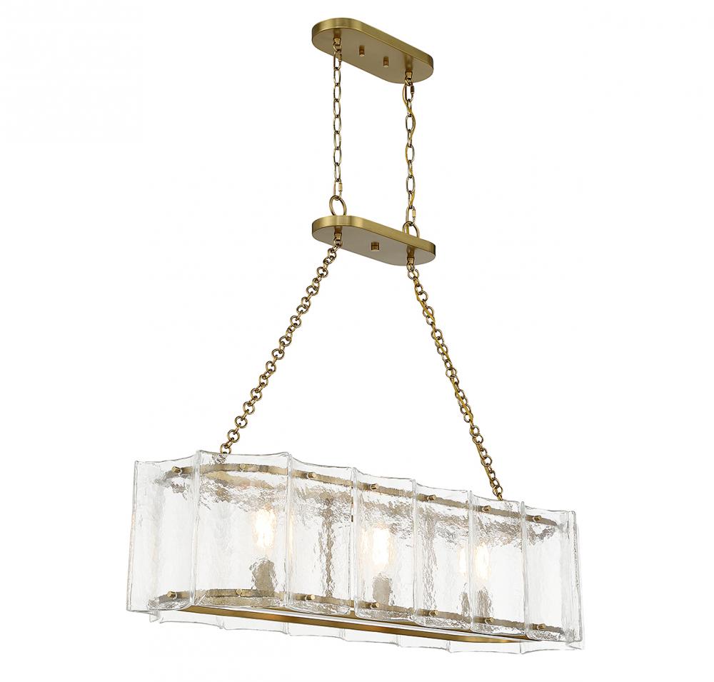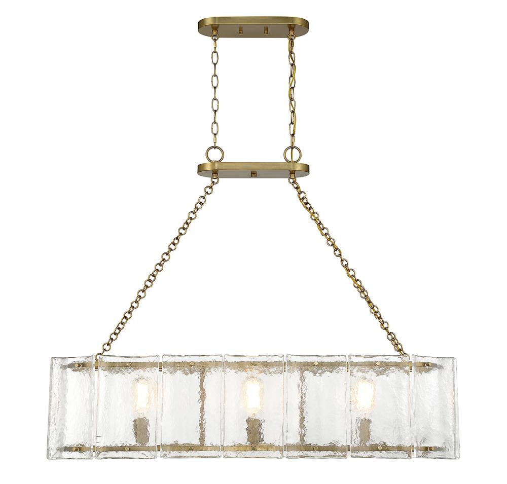 Bring a beautiful ocean-inspired lighting look to your home with the Savoy House Genry 3-light trestle. This linear design is decorated with rippling panes of handmade glass and finished in warm brass. Genry is 31.5" in height, 41" in length and 13" in width. It uses 3 standard size bulbs of up to 60 watts per bulb (bulbs not included).