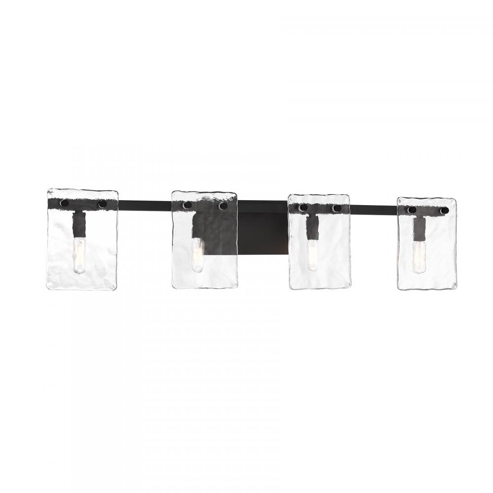 Bring a beautiful ocean-inspired lighting look to your home with the Savoy House Genry 4-light bath bar. It is decorated with rippling panes of handmade glass and finished in Matte Black. Genry is 7.75" in height, 35" in width and extends 5.5" from the wall. It uses four candelabra size bulbs of up to 60 watts per bulb. Bulbs not included. This bath light is damp area rated and must be installed as shown.