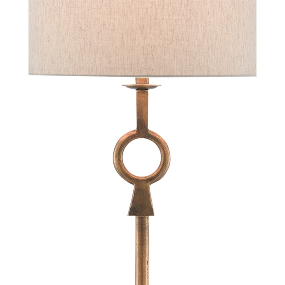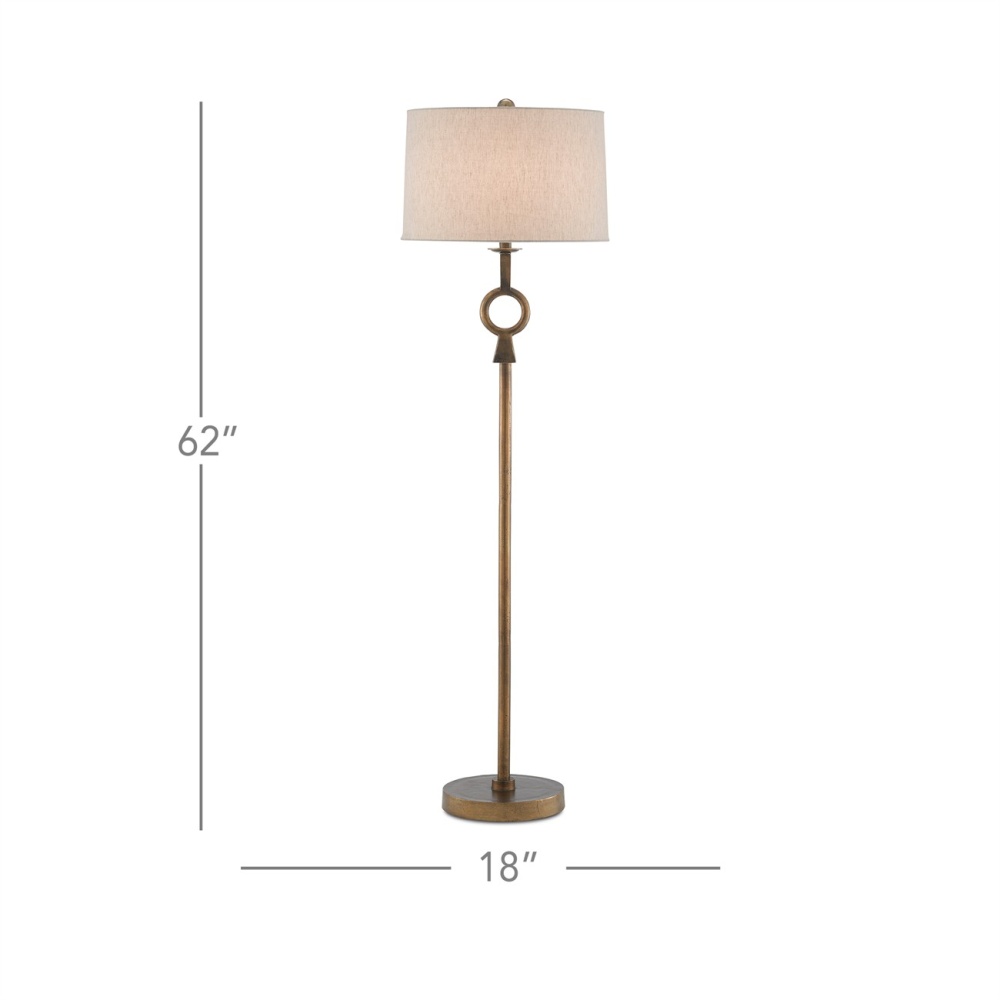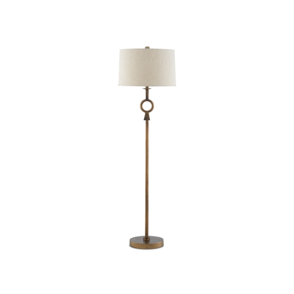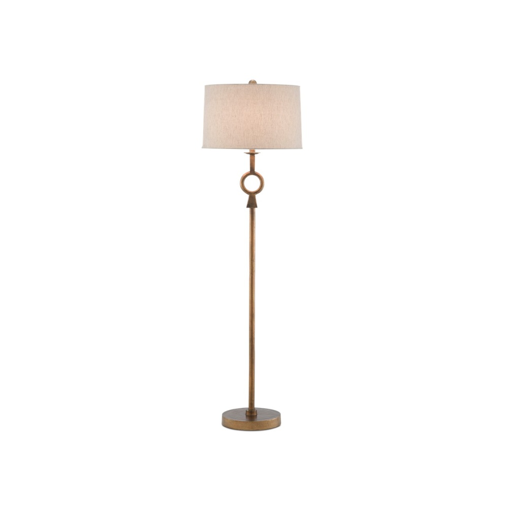 The Germaine Floor Lamp has a cleverly placed circlet on its stem-like body made of aluminum in an antique brass finish. A finial in the same finish fastens the natural flax shade to the brass lamp.