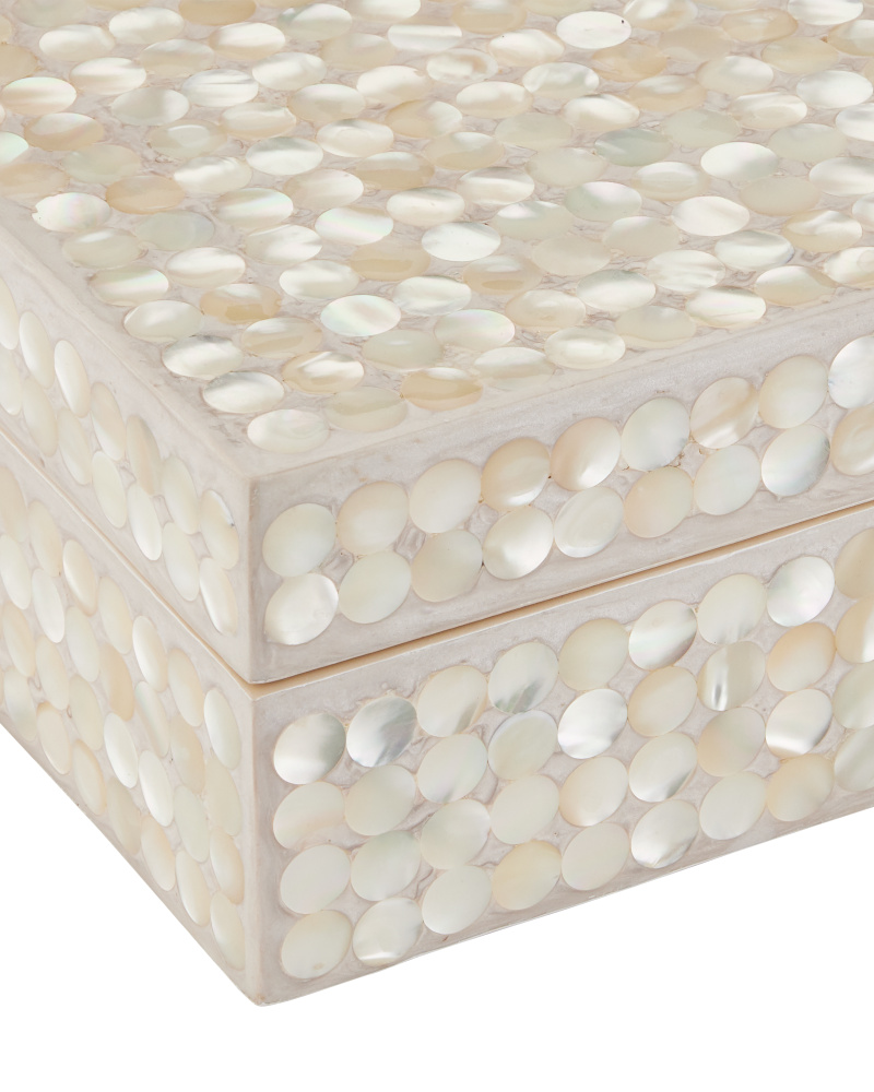A shimmering duo of compositions, the Gerri Dot Box Set includes two white decorative boxes covered in tiny circlets of mother of pearl. The process of placing the material so uniformly on the sides and the top of these boxes is a painstaking process that takes hours to complete. The circlets are held in place by the composite into which they are set. The intermingling of crisp white and pale ivory pieces of shell brings these boxes added texture.