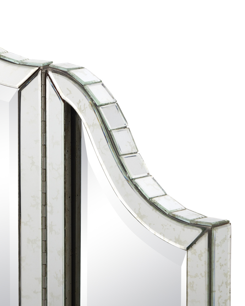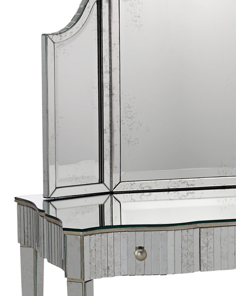 The Gilda Vanity Mirror is Hollywood glamour personified with its mirror-on-mirror composition. The fluted shape of its top calls to mind studio starlets who sashayed through their roles in long flowing gowns. Paired with the Gilda vanity table, the set is a nod to the Venetian glassmakers who made mirrored furniture wildly popular. It comes with a metal cleat for hanging and a safety bracket for mounting it to the vanity.