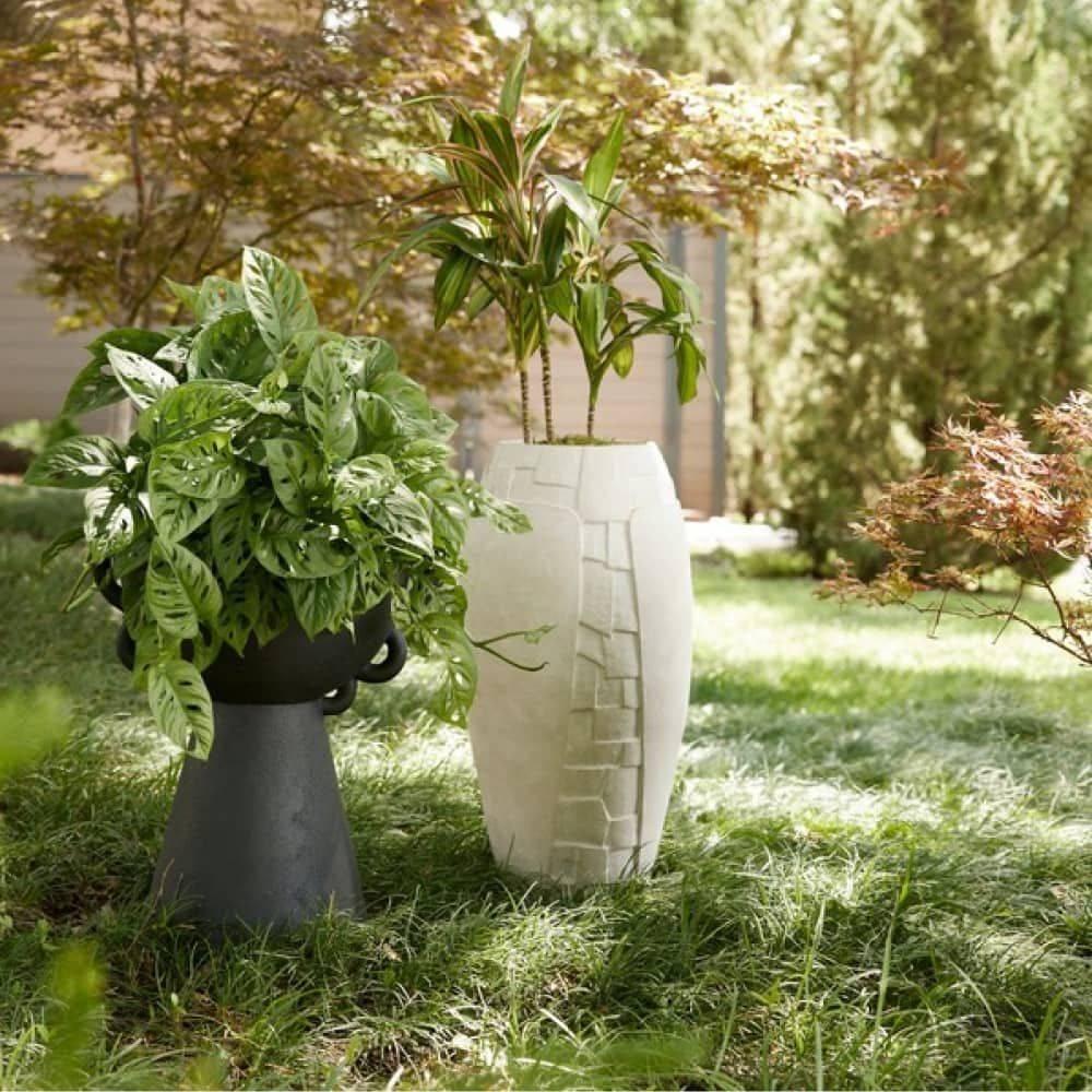 Inspired by Art Nouveau-style jewelry depicting a dragonfly, our terracotta planter's hand-carved eggshell finish surface offers a harmonious balance of figural motifs and natural elements. This intriguing texture is mirrored front and back. A removable rubber stopper is at the bottom for easy drainage. Finish will vary.