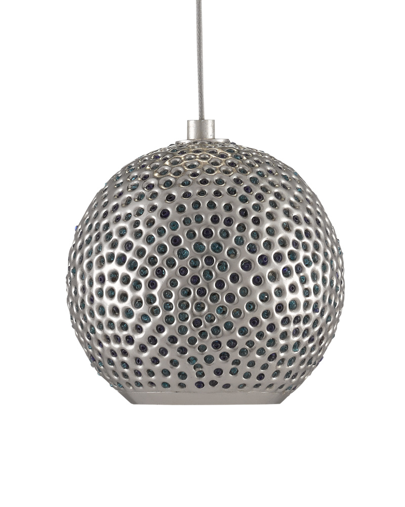 Our Giro Round 15-Light Multi-Drop Pendant has metal shades that are pierced by hand; the textural globes in a mix of painted silver and nickel finishes on point for modern farmhouse interiors. Small blue beads placed in some of the piercings add a lovely color to the silver pendant as light strikes them. The canopy of this piece is luminous in a painted silver finish. This fixture is among Currey & Company's multi-drop pendant collection, which includes multiple configurations.