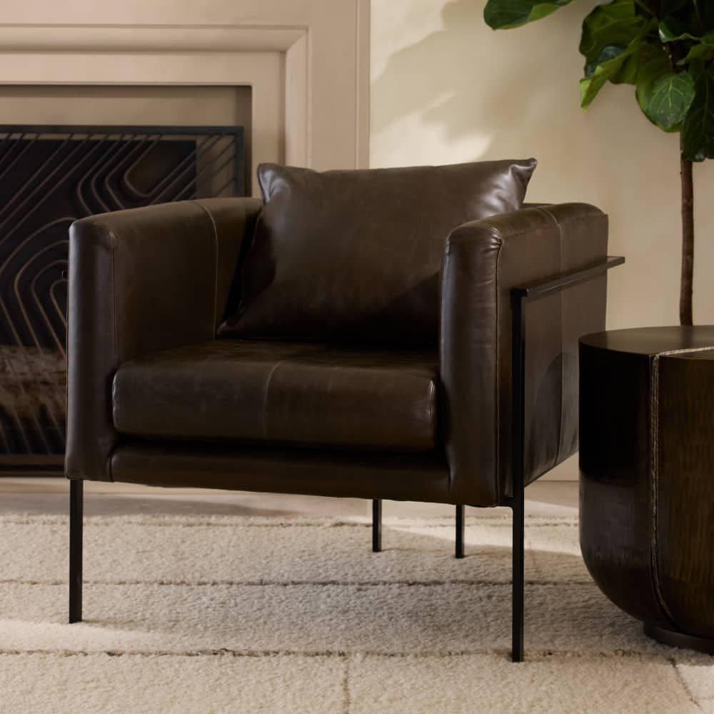 This modern club chair pairs a geometric form with sophisticated materials. An industrial frame of blackened powder coated iron cradles a seat of ore leather for a cantilevered effect. Cinched back legs and split-quarter stitching add to the masculine aesthetic. The matching seamed pillow provides support. Leather will vary.