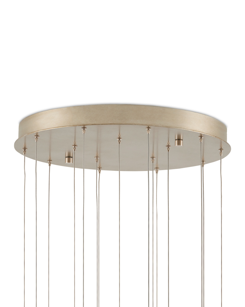 The faceted shades of the Glace White Round 15-Light Multi-Drop Pendant are made of panes of white art glass joined with seams of metal in an antique brass finish. The organic shape of the shades and the fact they hang at differing heights enhance the personality of this white pendant, which will ornament a space like a piece of jewelry. Art glass is one of the most artisanal materials that can be used, as its swirling opaque surface creates a milky glow whether lights are switched on or not. The canopy of this piece is luminous in a painted silver finish. This fixture is among Currey & Company's multi-drop pendant collection, which includes multiple configurations.