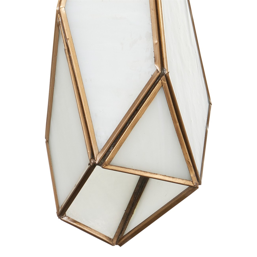 The faceted shades of the Glace White Rectangular 7-Light Multi-Drop Pendant are made of panes of white art glass joined with seams of metal in an antique brass finish. The organic shape of the shades and the fact they hang at differing heights enhance the personality of this white pendant, which will ornament a space like a piece of jewelry. Art glass is one of the most artisanal materials that can be used, as its swirling opaque surface creates a milky glow whether lights are switched on or not. The canopy of this piece is luminous in a painted silver finish. This fixture is among Currey & Company's multi-drop pendant collection, which includes multiple configurations.