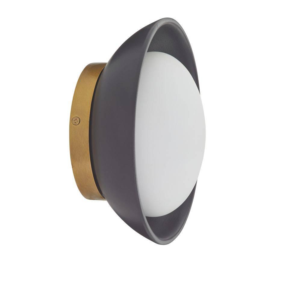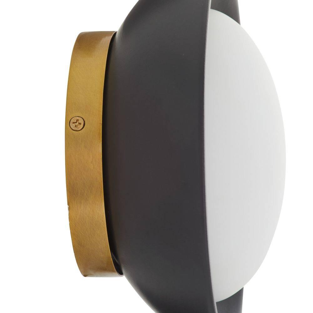 THIS SIMPLE, VERSATILE FORM MARRIES A MATTE BLACK CERAMIC SHADE AND A SOFTLY FROSTED OPAL LIGHT FOR A VERSATILE SCONCE THAT CASTS A FLATTERING GLOW IN ANY SPACE. THE EFFECT IS MULTIPLIED WHEN INSTALLED IN GROUPINGS OR IN COMBINATION WITH GLAZE SCONCES FOR ONE-OF-A-KIND DESIGNS. HELD BY ANTIQUE BRASS-PLATED STEEL. DAMP-RATED, ALTHOUGH LIMITED COVERED OUTDOOR AREAS MAY AFFECT FINISH.