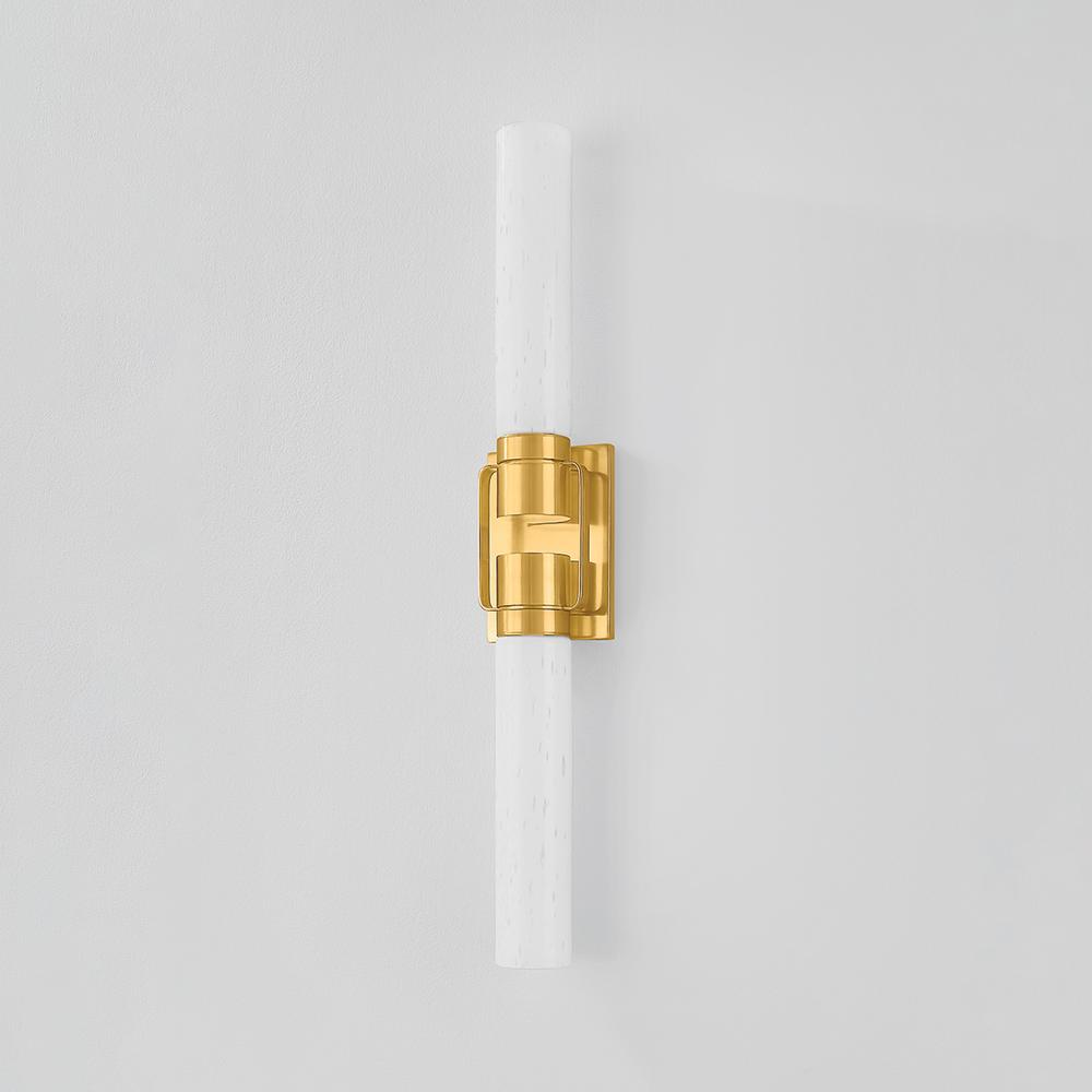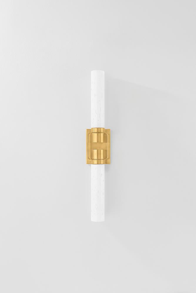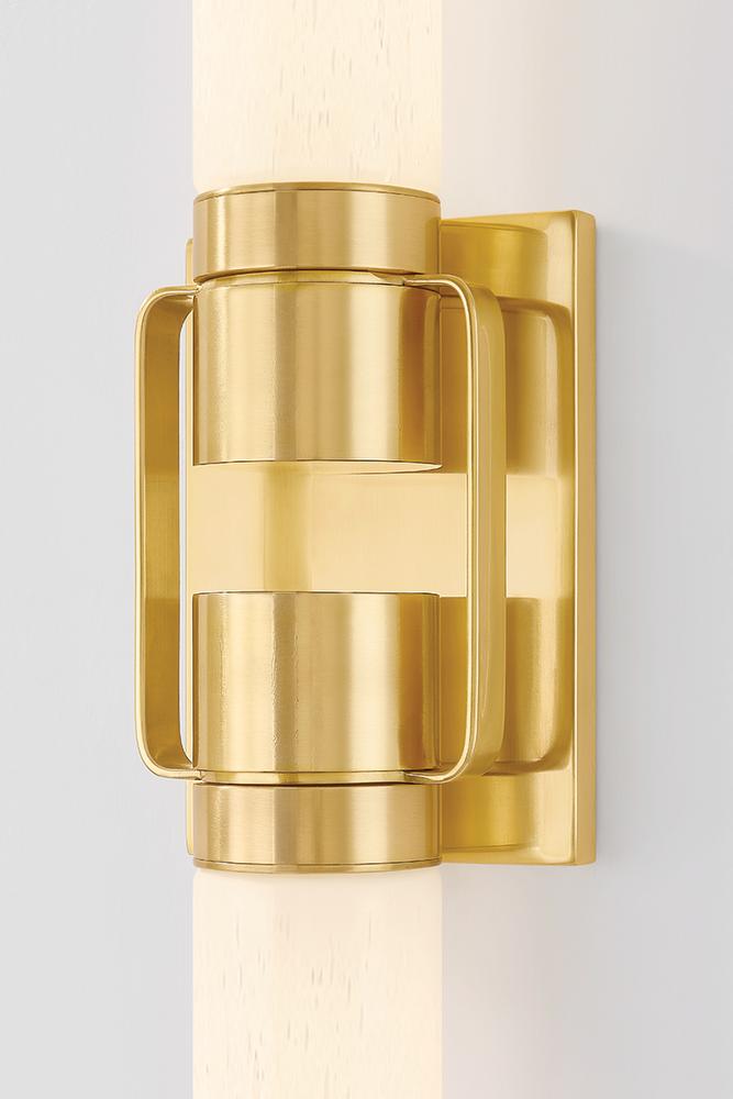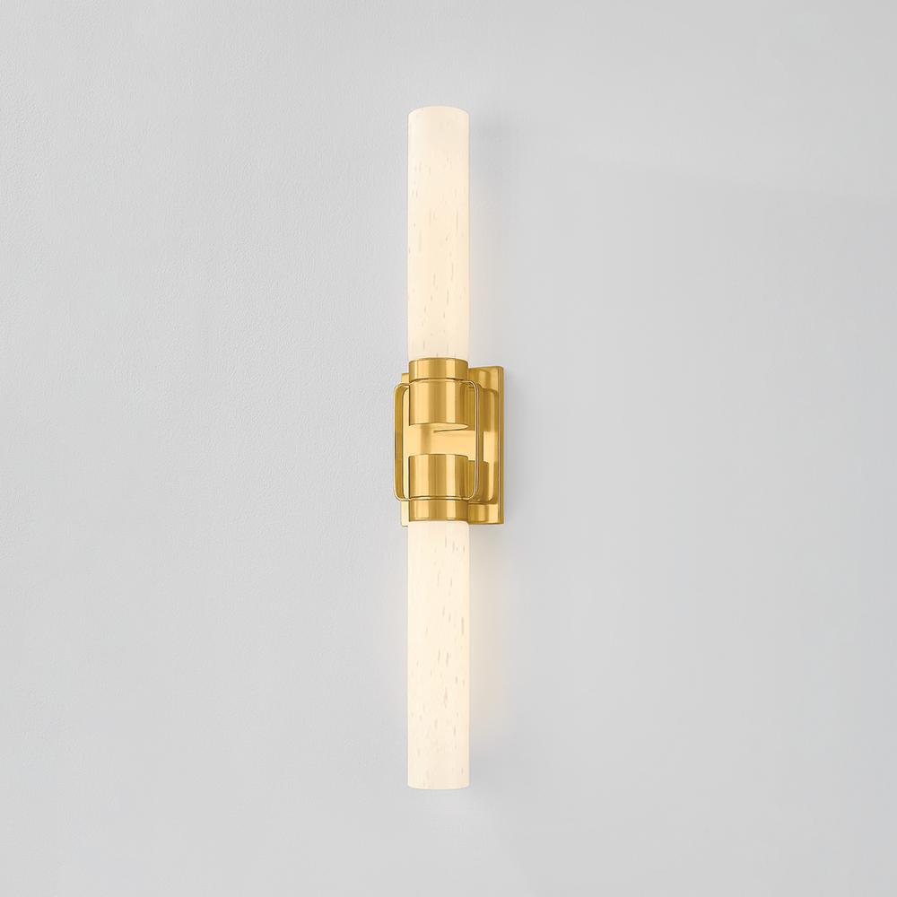 A minimalist silhouette is elevated by mechanical metalwork in Glen Oaks. This narrow sconce features two cylinders of seedy opal glass attached to a slim rectangular backplate. Adding a clean-lined detail, the two socket cups are connected with slender metal straps. Whether in the Aged Brass or Vintage Pewter finish, Glen Oaks brings elegant simplicity to a bath area.