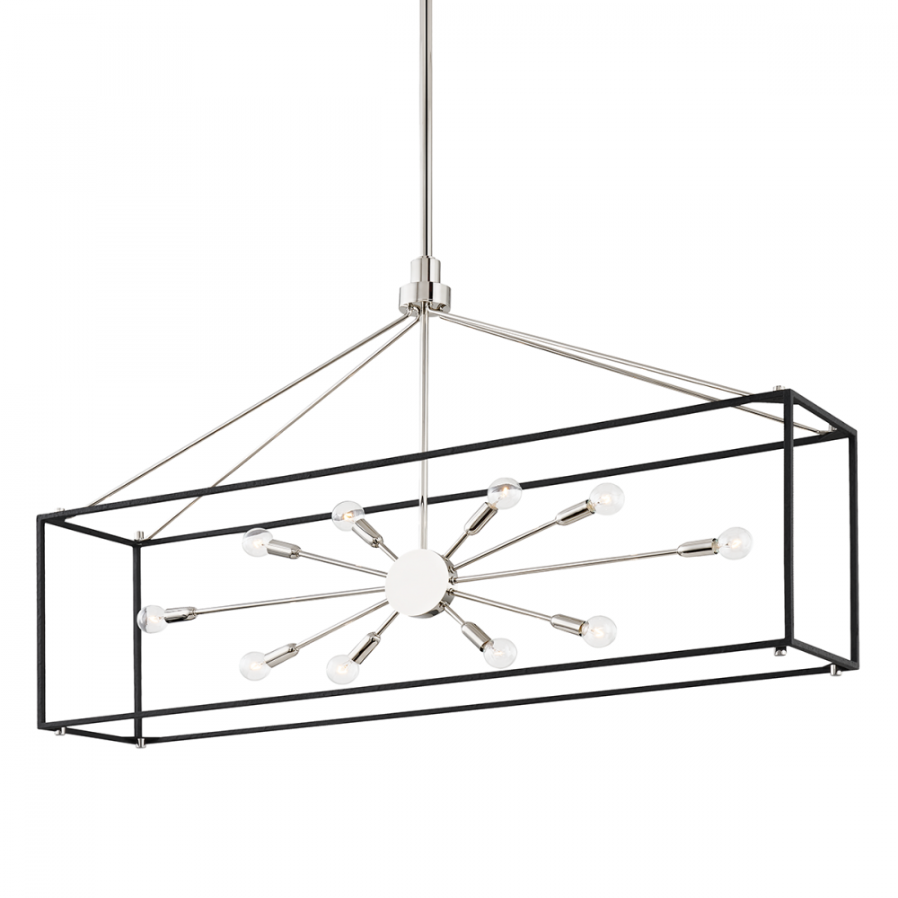 The launch of the Sputnik satellite in 1957 captured the world's imagination, dawning a new era of design innovation in the race to reach the stars. The Sputnik chandelier embodied this spirit of modernity and became an icon of mid-century style. Our Glendale pendant revives the innovative spirit of Sputnik by suspending the signature starburst within a crisp, black, textured iron cube to create a play of stunning effects. The capsule shape of the tungsten filament bulbs offers smooth respite from the striking linear motifs. Extending the starburst's sleek metal rays to anchor points in the cube's inner corners allows the chandelier to float within a darkly outlined space.