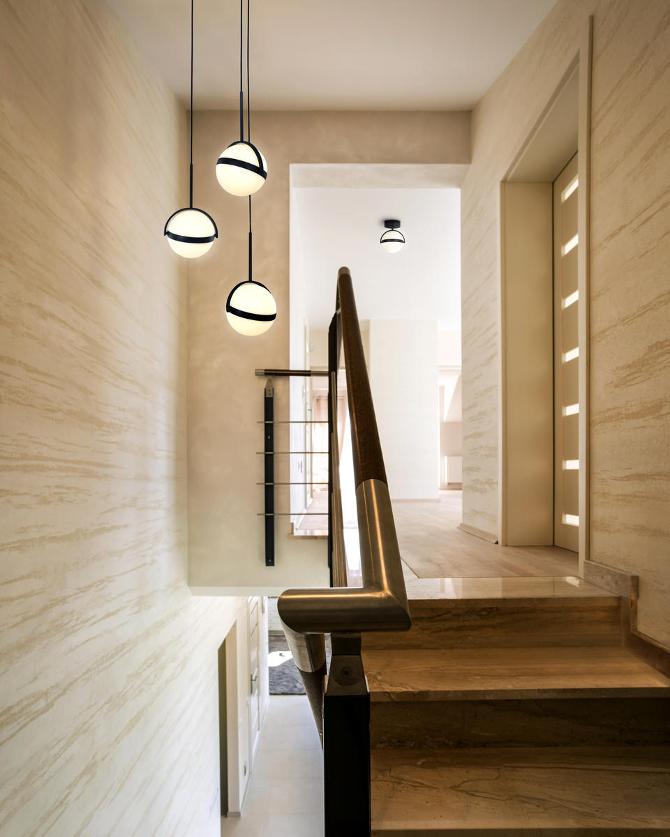 Globo is a statement in modernity-a simple metal band is wrapped around a glowing white orb that can be tilted in different directions to achieve your desired look. Offered in both Matte Black and Brushed Gold finishes.