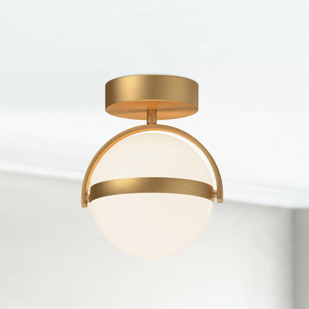 Globo is a statement in modernity-a simple metal band is wrapped around a glowing white orb that can be tilted in different directions to achieve your desired look. Offered in both Matte Black and Brushed Gold finishes.