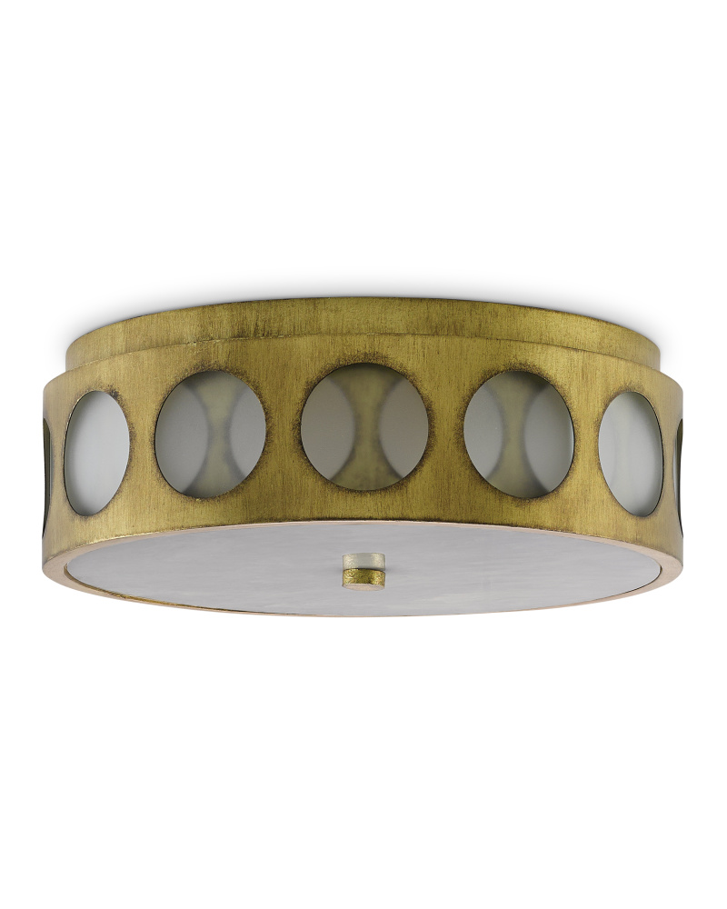 The Go-Go Flush Mount has a mid-century vibe with a shapely twist. The white opaque glass that makes up the vertical diffuser is slotted between two sheets of wrought iron that have been treated to a brass finish and off-set to create half-moon shapes within the row of circles on the flush mount. The bottom diffuser on this two-light fixture is also made of opaque glass. We offer a Go-Go pendant with the same dance of circles around its surface.