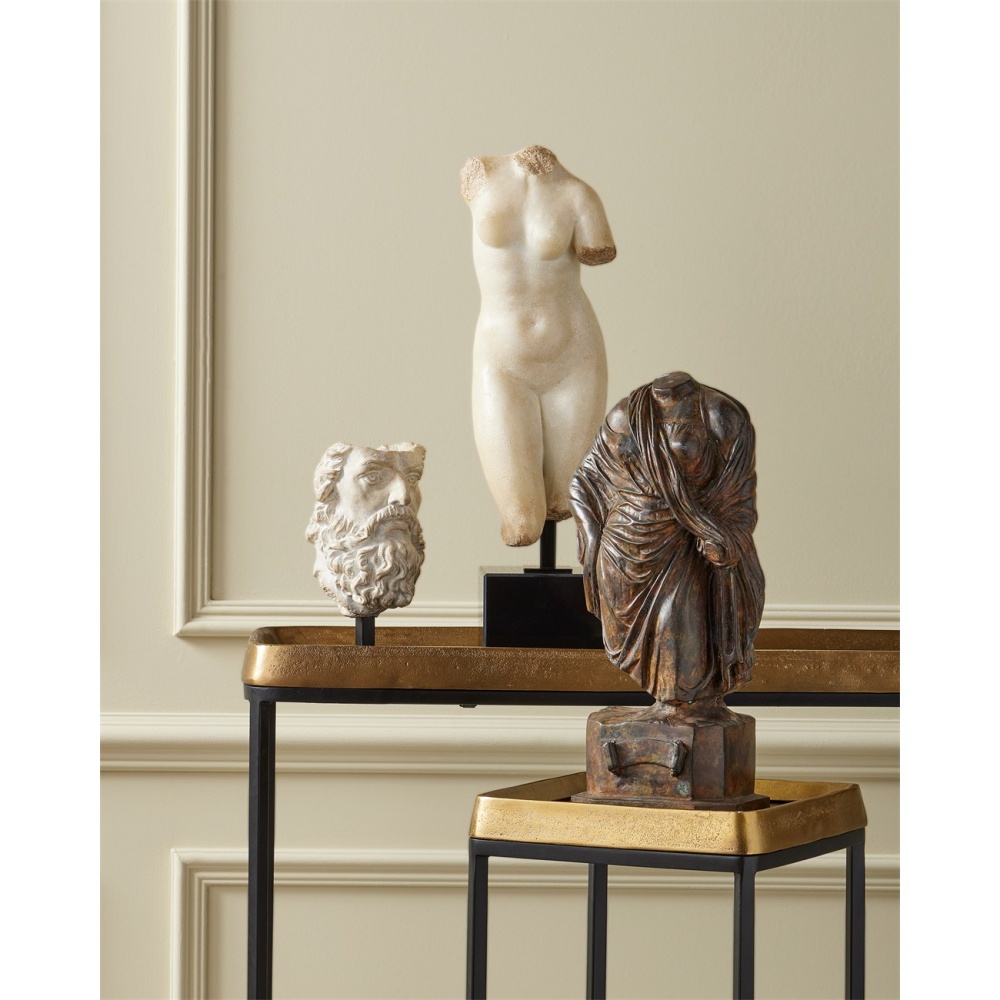 This Rubenesque figural sculpture convincingly replicates an antique statue of the Goddess Venus, though it is made of composite. It's the finish that fools the eye, the aged beige rubbed onto the surface so that it collects in the rougher spots, mimicking how the stone would have looked where it was broken off. The beige sculpture is attached to a solid black marble base and mounted to read like it's a museum piece.