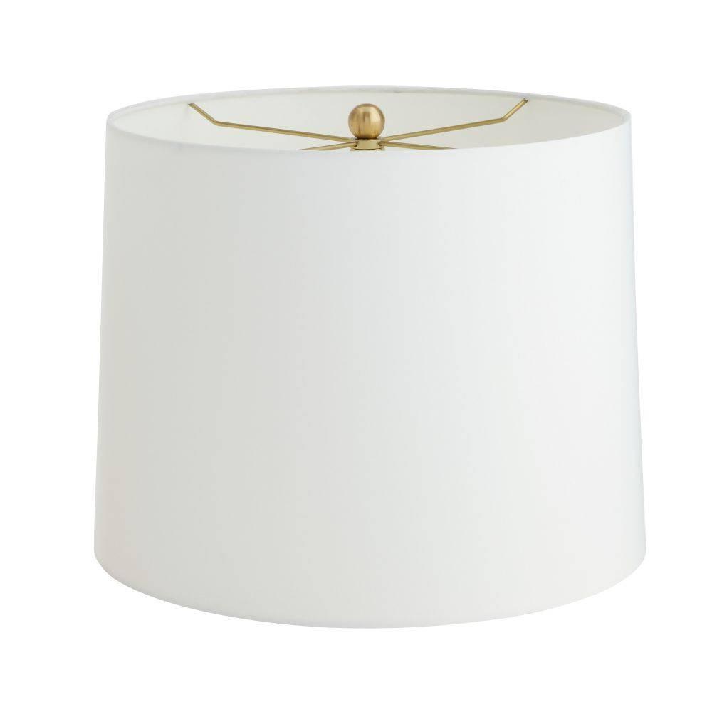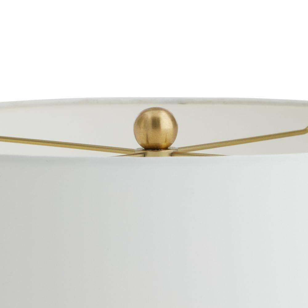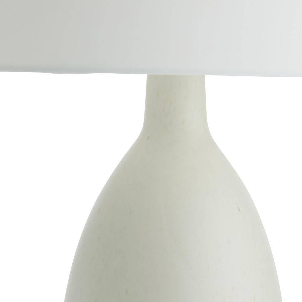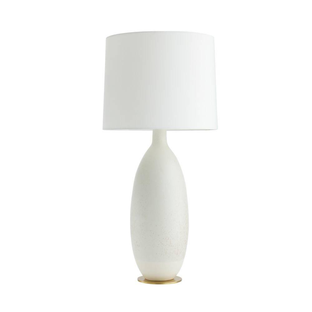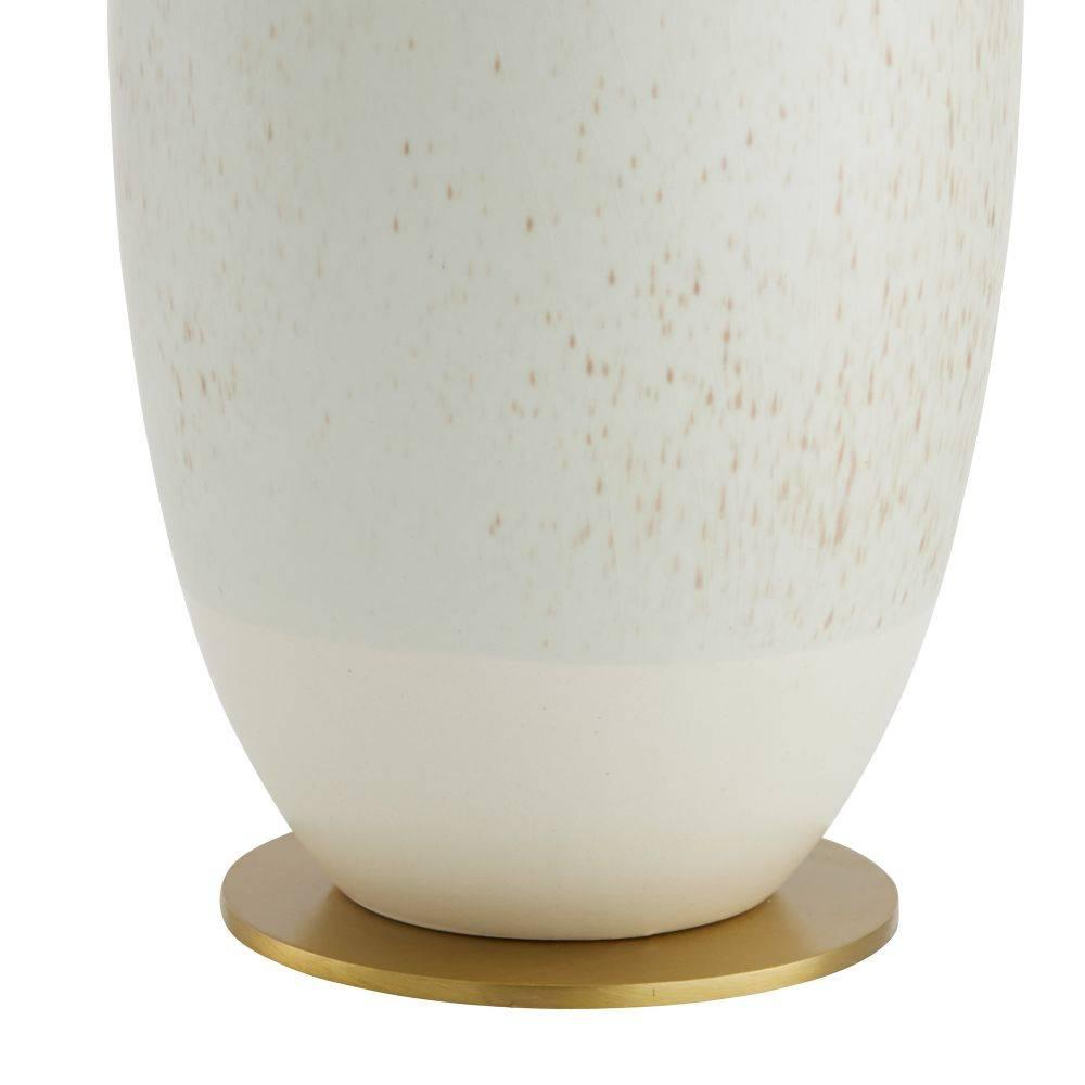 Our quail egg reactive glaze puts the simple form of the Gola in the spotlight. Finished with antique brass-plated steel hardware and matching finial, the bottle silhouette of porcelain makes it a tranquil accent for any surface. Off-white microfiber drum shade with off-white cotton lining. Finish will vary.