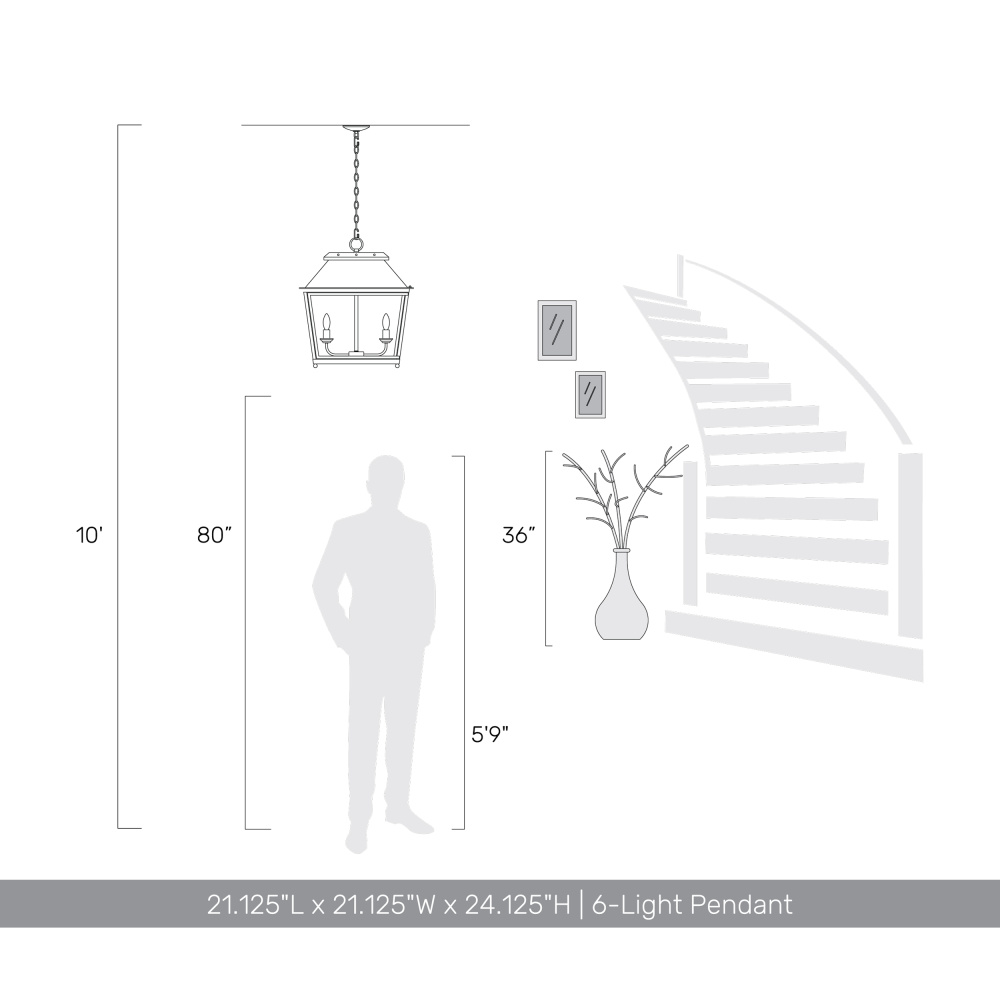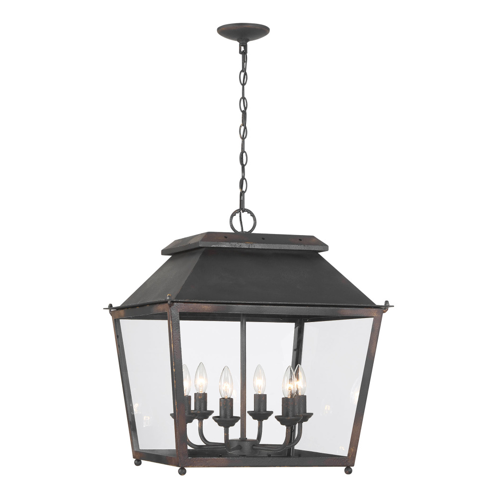 Bring rustic elegance into your home with the Golden Lighting Abingdon 6-light Pendant in Antique Black Iron. Featuring a glass shade and an Antique Black Iron frame, it creates a striking atmosphere. The clear glass shade offers brilliant, unobstructed light, polished to a high-gloss shine, allowing the beauty of the bulb and the fixture's design to take center stage. Crafted with an Antique Black Iron finish, this pendant captures the raw, authentic charm of a bygone era, combining heavily weathered textures with a rugged look. Ideal for dry locations, this pendant is perfect for indoor spaces such as kitchens and living rooms. It's easy to install on sloped ceilings and has an adjustable height of 27.625" to 101.125" to suit any setting. With overall dimensions of 21.13"W x 24.13"H x 21.13"D, it requires six E12 Candelabra base bulbs (not included), with a maximum wattage of 60 per bulb. Close with lifestyle appeal and a highlight on the artisanal craftsmanship, making it a distinctive piece for your home.