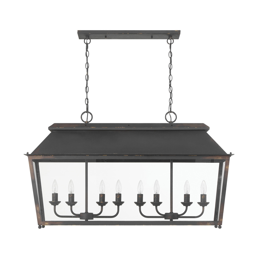 Bring rustic elegance into your home with the Golden Lighting Abingdon 8-light Island Light in Antique Black Iron. Featuring a glass shade and an antique black iron frame, it creates a welcoming atmosphere. The clear glass shade offers brilliant, unobstructed light with its smooth, polished finish, making it versatile for various styles, from farmhouse to industrial. Capture the raw, authentic charm of a bygone era with the antique black iron finish, showcasing textured layers that reveal a warm, antiqued gold base beneath. This bold color is perfect for industrial, rustic, and farmhouse designs, adding a powerful statement of age and handcrafted character. Tailored for kitchen islands, this fixture is dry location rated, making it ideal for indoor spaces such as living rooms and hallways. It is also sloped-ceiling compatible and offers adjustable height ranging from 28" to 101.5" for customized installation. Overall Dimensions: 42"W x 24.13"H x 12.5"D. Requires 8 E12 candelabra base bulbs (not included), with a maximum of 60 watts per bulb. Enhance your space with this artisanal piece that celebrates craftsmanship and unique character, perfect for bringing warmth and style to your home.