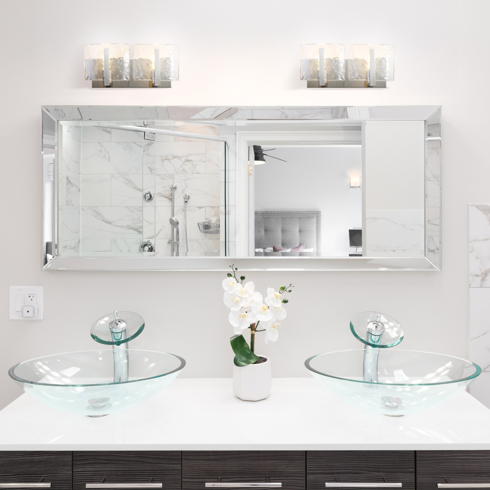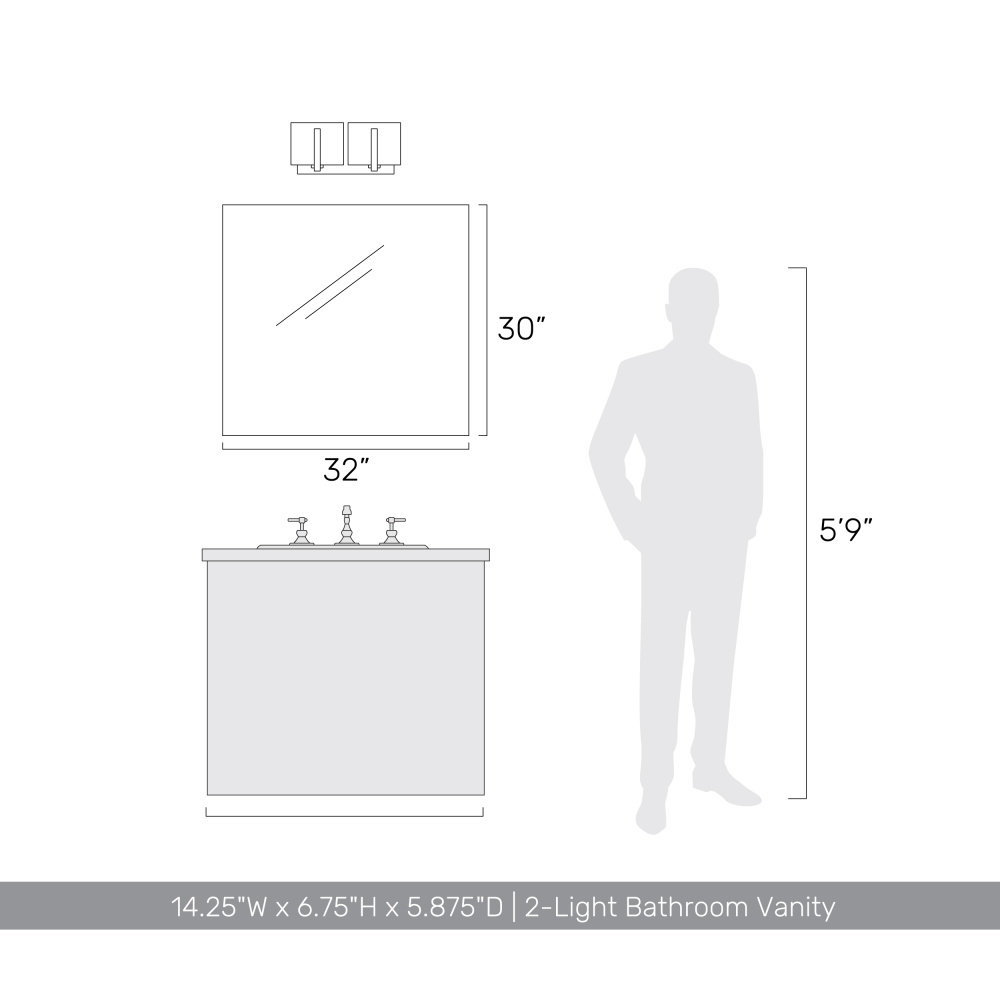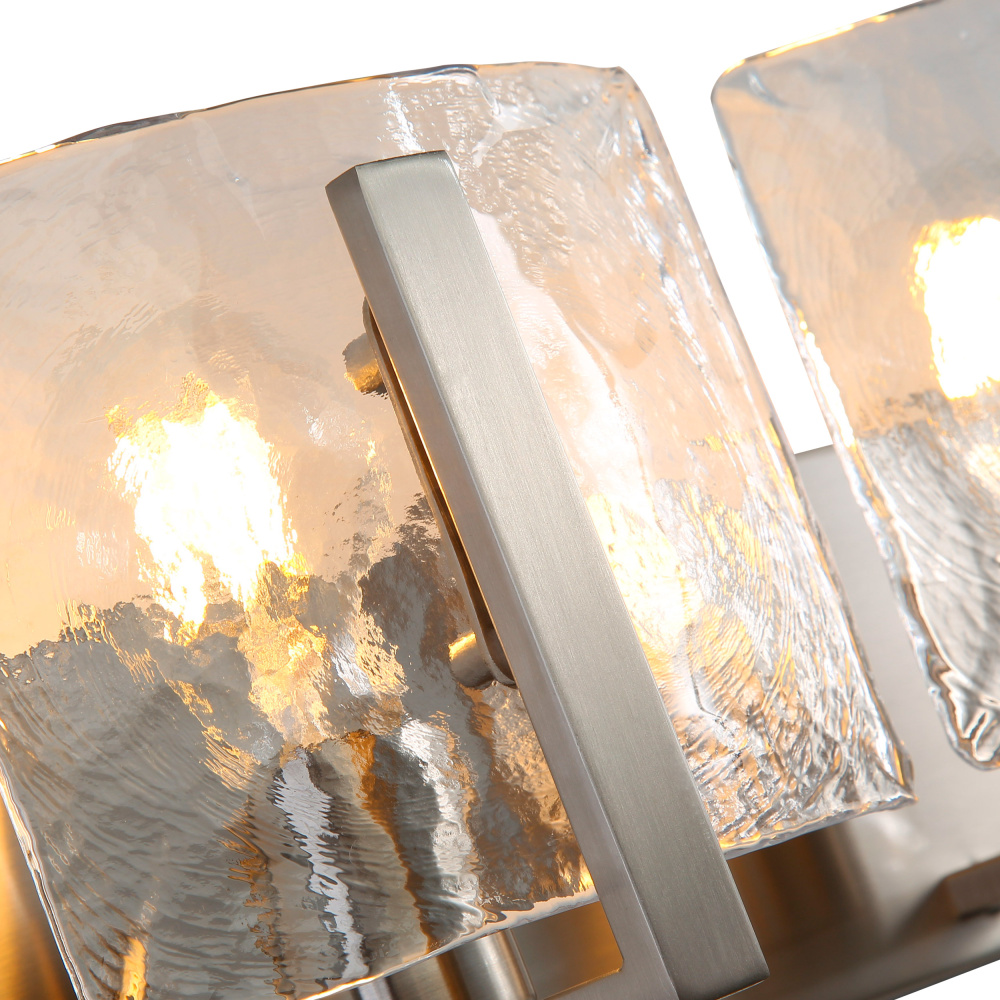Bring nature-inspired elegance into your home with the Golden Lighting Aenon 2-light Vanity in Pewter. Featuring a glass shade and a Pewter frame, it creates a welcoming atmosphere. The glass shade showcases Hammered Water Glass, designed to create a beautifully distorted and refractive light effect. This artisanal glass captures the dynamic essence of ice and water, providing a stunning glow and casting intricate patterns. The Pewter finish offers a soft and classic alternative to brighter silver tones, distinguished by its medium-grey hue with subtle warmth. This finish is created through a durable electroplating process that results in a beautiful satin lustre, gently diffusing light for an elegant, non-glare glow. Ideal for enhancing the ambiance in bathrooms, the fixture is damp location rated for rooms with occasional moisture. Installation is straightforward, requiring 2 E26 Medium base bulbs (not included), with a maximum wattage of 100 per bulb. Overall dimensions are 14.25"W x 6.75"H x 5.88"D. Close with a lifestyle appeal that harmonizes nature and design, ensuring quality and artistry in your space.