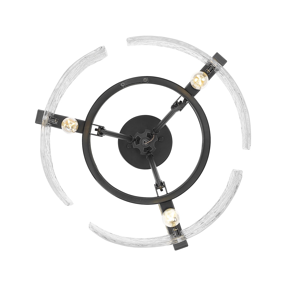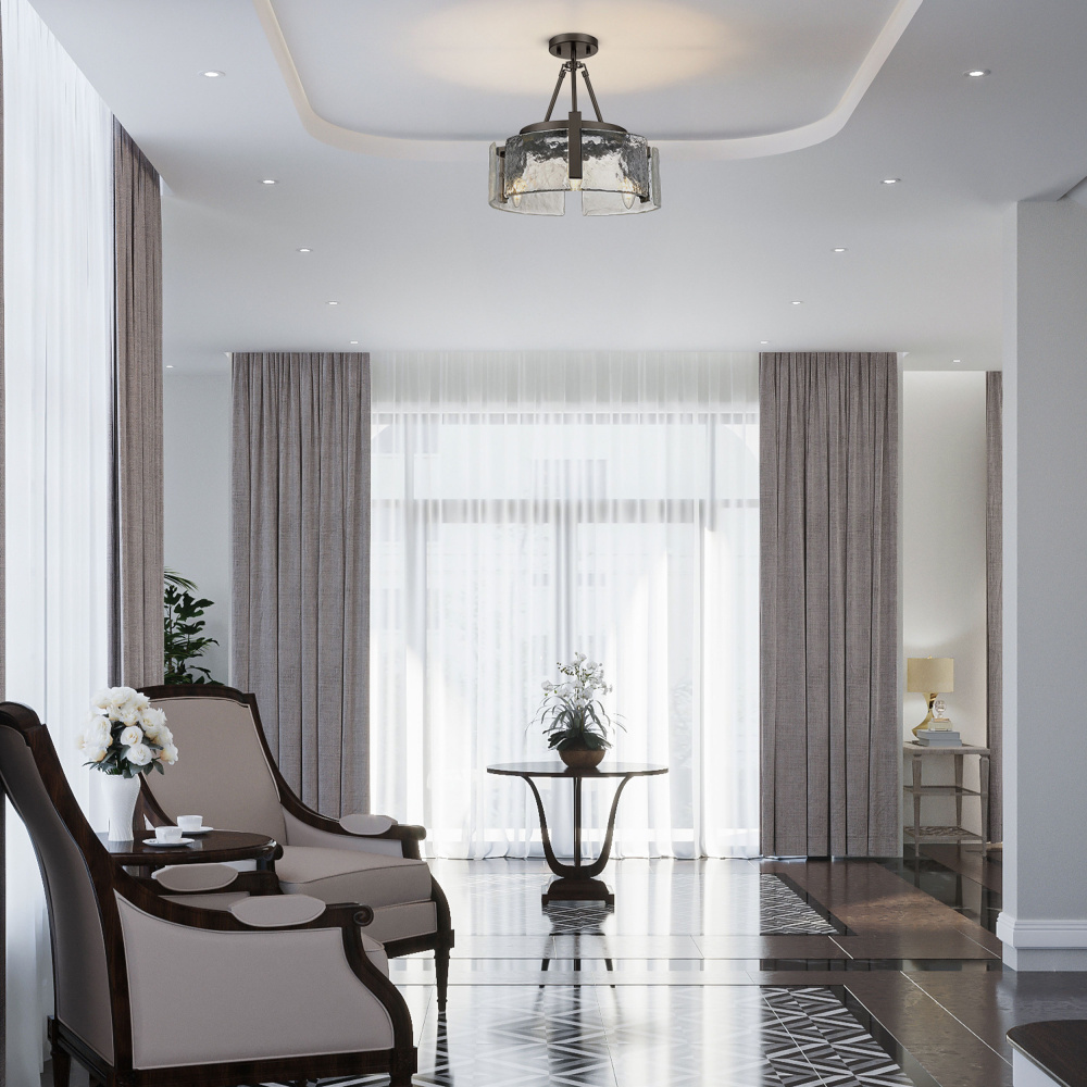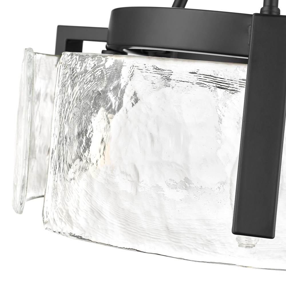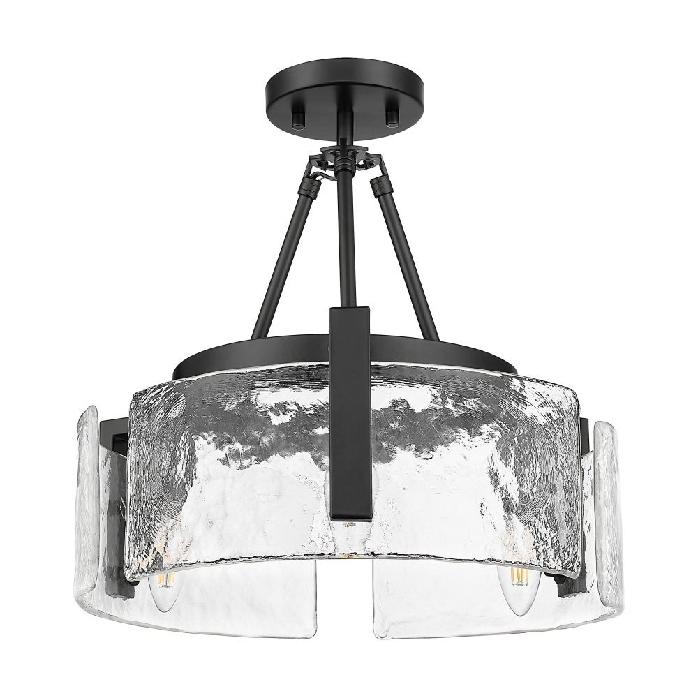 Bring nature-inspired elegance into your home with the Golden Lighting Aenon 3-light Semi-Flush Mount. Featuring a glass shade and a matte black frame, it creates a welcoming atmosphere. The hammered water glass shade showcases a heavy, irregular texture that mimics the beauty of ice and water, refracting light in a dazzling display. The matte black finish epitomizes clean, modern style with its smooth, non-reflective surface, offering versatile appeal that complements various decors. Perfect for entryways, bedrooms, kitchens, and living areas, this fixture is damp location rated for semi-enclosed spaces. It features a convertible design that allows for adjustable height installation (min: 10" - max: 15.25") to fit your specific space needs. Overall dimensions are 16.5"W x 10"H x 16.5"D, and it requires 3 E12 candelabra base bulbs (not included) with a maximum wattage of 60 per bulb. Experience the harmony of artistry and quality with this exquisite lighting fixture.