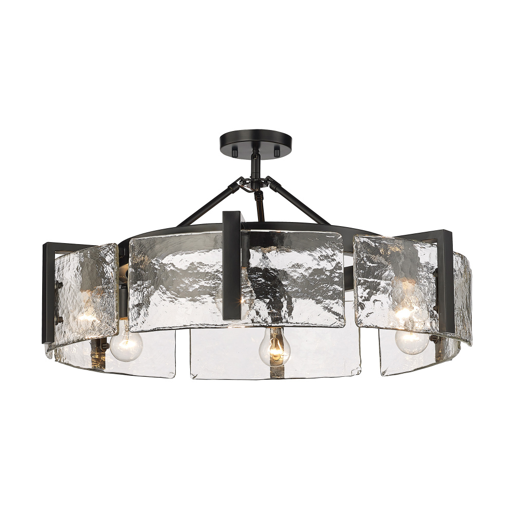 Bring nature-inspired elegance into your home with the Golden Lighting Aenon 6-light Semi-Flush Mount in Matte Black. Featuring a glass shade and a matte black frame, it creates a welcoming atmosphere. The glass shade showcases hammered water glass, celebrated for its uniquely textured surface, reminiscent of ice and flowing water. This remarkable design captures light in intricate patterns, transforming any space. The matte black finish offers a timeless, smooth surface that complements various decors, enhancing every room's aesthetic. Perfect for entryways, kitchens, and living areas, this fixture is damp location rated for covered spaces. Its adjustable height ranges from 8.75" to 14", providing versatility for low ceilings. Overall Dimensions: 27.75"W x 8.75"H x 27.75"D. Requires 6 E26 Medium base bulbs (not included), max 60 watts each. The Golden Lighting Aenon Semi-Flush Mount is a stunning blend of modern design and exceptional craftsmanship, making it an excellent choice for any contemporary setting.
