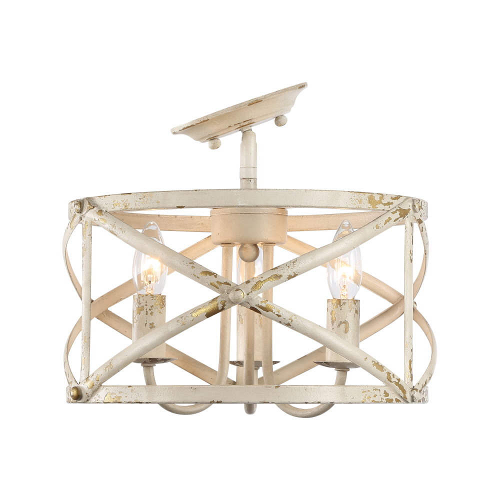 Embrace traditional elegance in your home with the Golden Lighting Alcott 3-light Semi-Flush Mount. Featuring a beautiful Antique Ivory finish, this fixture adds warmth to any room. With no shade, it allows for direct illumination while showcasing the intricate craftsmanship of its distressed metal surface. This finish reflects a storied charm, perfect for shabby chic and farmhouse styled interiors. Rated for damp locations, it’s designed for safety on angled or vaulted ceilings, providing ultimate versatility. Overall Dimensions: 13.5"W x 11.13"H x 13.5"D. Requires 3 E12 Candelabra base bulbs (not included), each with a maximum of 60 watts. Add a touch of inviting charm to your home decor with this high-quality, artisan-crafted light fixture.