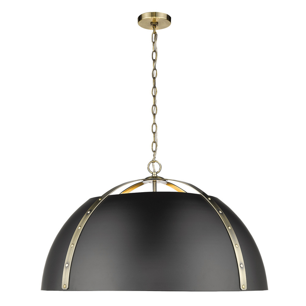 Bring grandeur into your home with the Golden Lighting Aldrich 8-light Chandelier. Featuring a metal shade and an Aged Brass frame, it creates a welcoming atmosphere. This metal shade ensures a powerful illumination effect, creating a sophisticated ambiance that complements a variety of decor styles. The deep, matte black finish adds to the pendant's elegance while providing a chic look. Our luxurious Aged Brass finish offers a warm, inviting glow reflective of vintage heirlooms. Its finely spun texture captures and diffuses light beautifully, enhancing the surrounding environment. Perfect for dining rooms and foyers, the fixture is Dry Location Rated, suitable for indoor spaces protected from moisture. With an adjustable height (Min: 18.125"- Max: 90.125"), installation is a breeze, making it adaptable to your design needs. Overall Dimensions: 30"W x 17.38"H x 30"D. Requires 8 E26 medium-base bulbs (not included, Max 60 watt per bulb). Experience the blend of quality craftsmanship and design with Golden Lighting in your home.