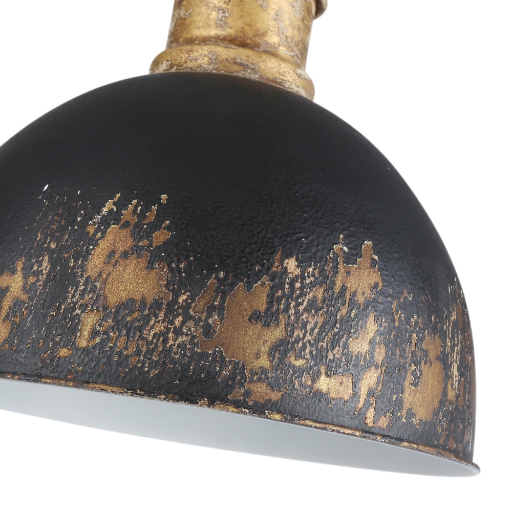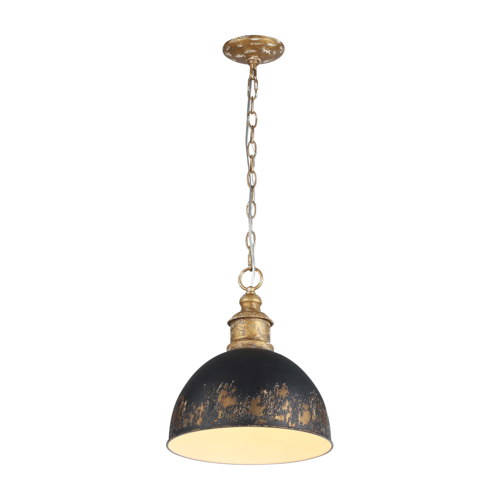 Bring traditional charm into your home with the Golden Lighting Alison 1-light Pendant. Featuring a metal shade and a vintage gold frame, it creates a welcoming atmosphere. The weathered black iron metal shade presents a heavily distressed finish, adding a rugged, industrial charm that enhances any space's decor. The unique multi-layered finish creates subtle highlights that reveal the authenticity of this piece. The artisanal vintage gold finish is crafted with a one-of-a-kind chippy texture, making this pendant light a true statement piece in rustic or contemporary settings. Perfect for kitchens, dining rooms, or entryways, this fixture is damp location rated and suitable for spaces with occasional moisture. Its adjustable height from 17.375" to 89.375" and sloped-ceiling compatibility make this pendant versatile for various arrangements. It has overall dimensions of 12"W x 13.88"H x 12"D and requires 1 E26 medium base bulb, max 100 watts. Embrace the vintage charm and quality craftsmanship with this stunning lighting fixture.