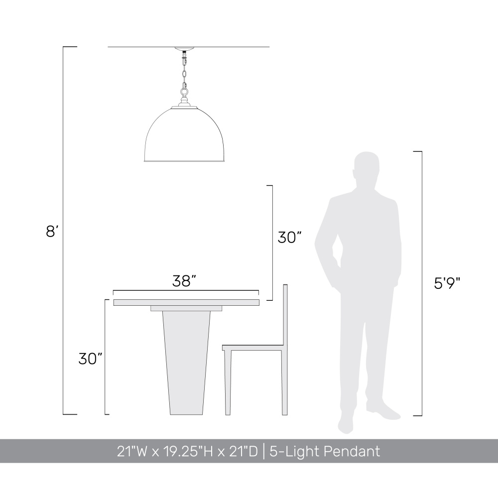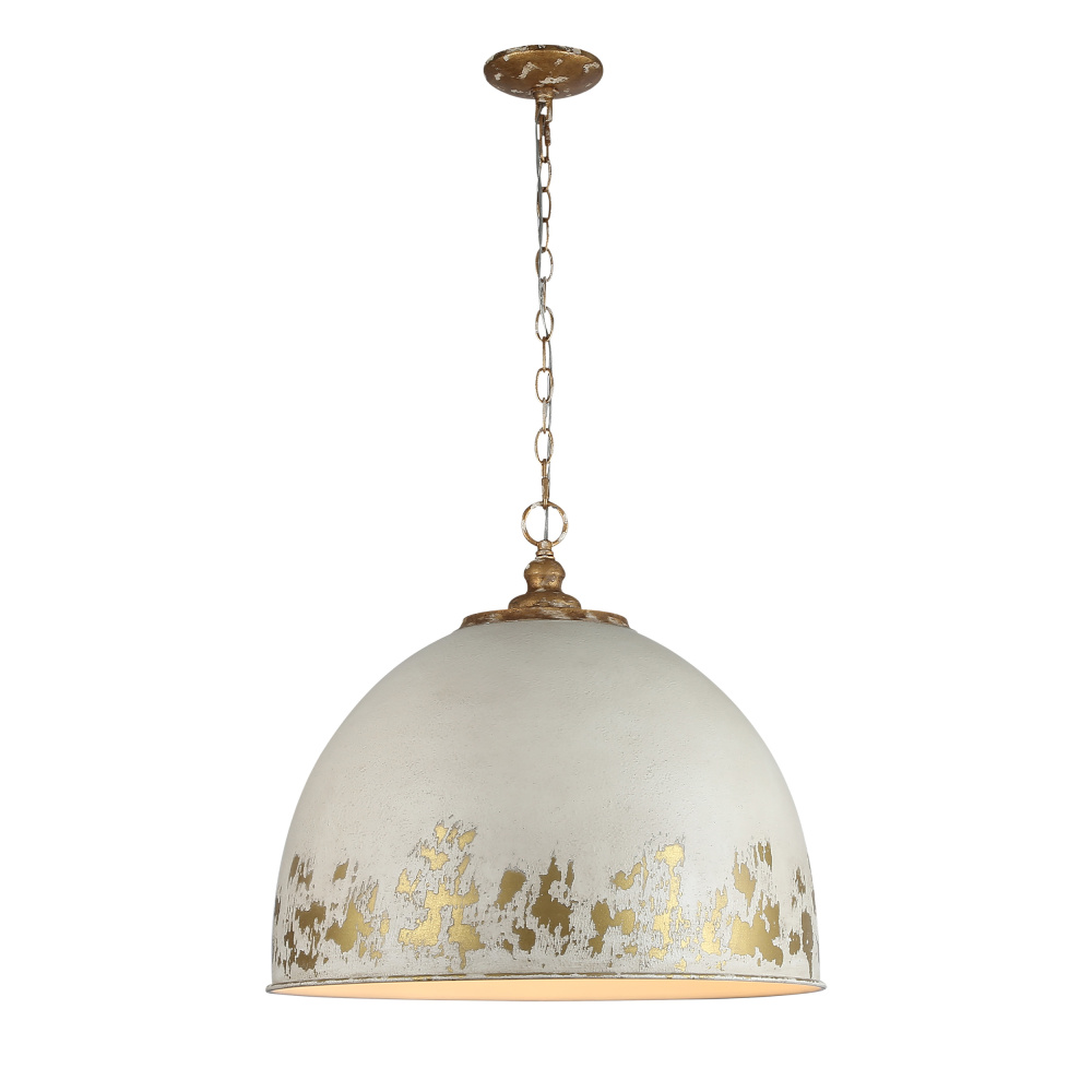 Bring farmhouse elegance into your home with the Golden Lighting Alison 5-light Pendant. Featuring a metal shade and a Vintage Gold frame, it creates a welcoming atmosphere. This metal shade enhances the light by showcasing an Antique Ivory finish with a creamy, off-white base and a textured, cracked surface, revealing elegant hints of gold underneath. This finish brings a timeless charm that beautifully complements various decor styles. The Vintage Gold finish is achieved through a meticulous hand-applied process, providing each piece with a unique and distressed appearance, ideal for those appreciating handcrafted quality. Perfect for use in kitchens, dining rooms, or bedrooms—this fixture is Dry Location Rated for indoor spaces not subject to moisture. Its sloped-ceiling compatibility and adjustable height allow for easy installation and customization to fit your space. Overall Dimensions: 21"W x 19.25"H x 21"D. Requires 5 E26 Medium base bulbs (not included), with a maximum wattage of 60 per bulb. Transform your living space with this stunning lighting piece that ensures quality and warmth.