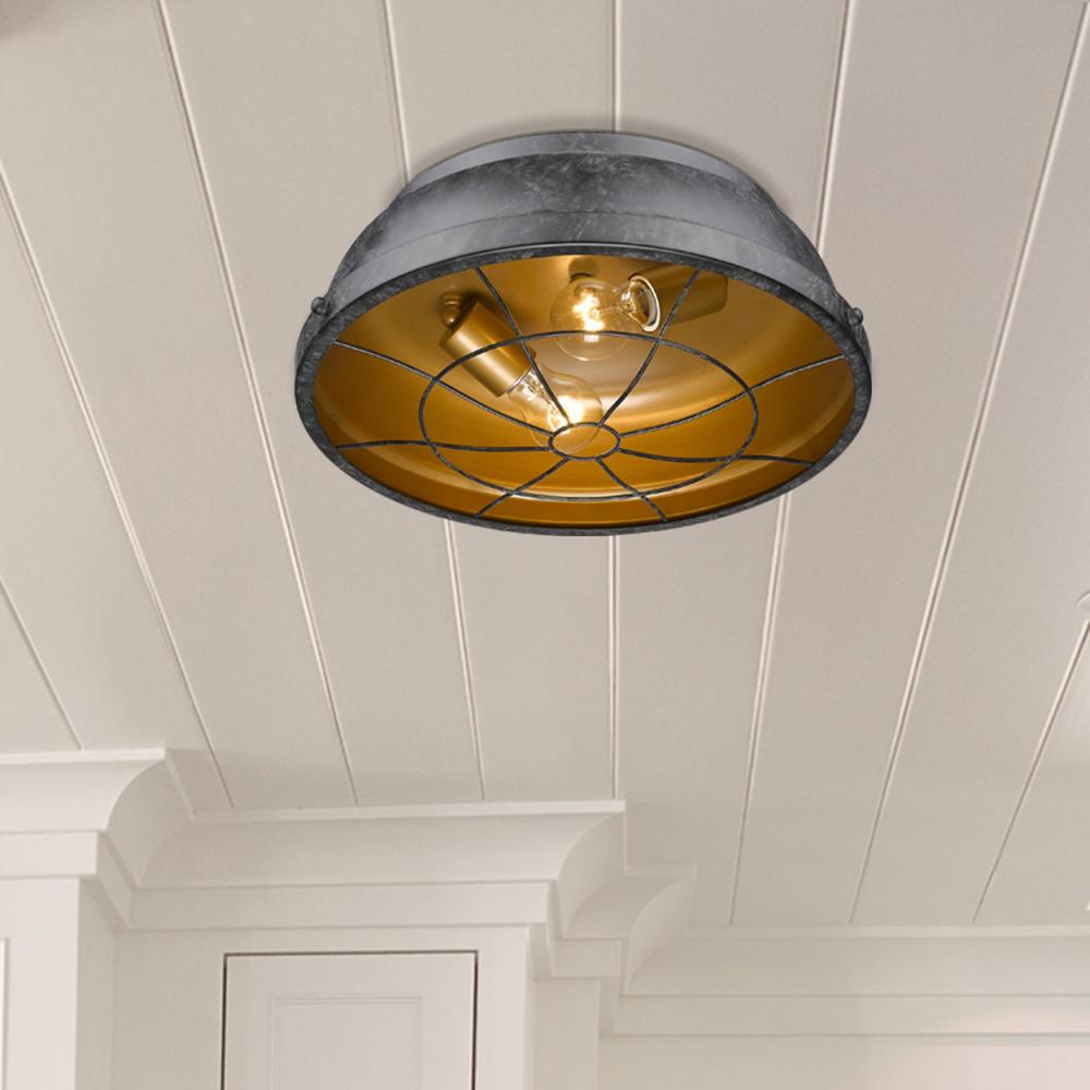 Bring industrial charm into your home with the Golden Lighting Bartlett 2-light Flush Mount in Black Patina. Featuring a metal shade and a Black Patina frame, it creates a welcoming atmosphere. The finish showcases a deep, matte charcoal black base treated with a soft, chalky gray wash, suggesting an aged aesthetic that adds character to your space. Ideal for low ceilings in hallways, closets, and bathrooms, it is Damp Location Rated, making it suitable for areas with occasional moisture. Requires 2 E26 Medium base bulbs (not included, max wattage 60) and measures 14"W x 5.5"H x 14"D, providing ample light with a rustic flair.