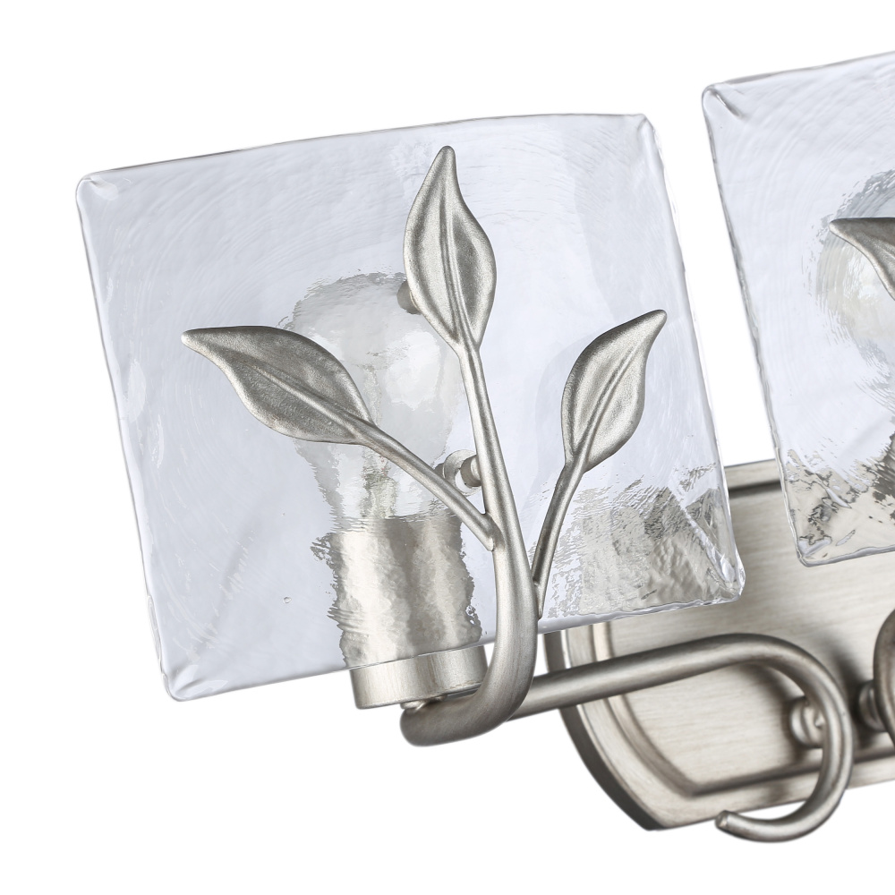 Bring nature-inspired elegance into your home with the Golden Lighting Calla 3-light Vanity in Peruvian Silver. Featuring a hammered water glass shade and a Peruvian Silver frame, it creates a welcoming atmosphere. The hammered water glass shade offers a heavy, irregular texture that not only refracts light beautifully but also adds an artisanal touch to your decor. This unique finish, inspired by ancient handmade silver, brings a rustic charm with its muted tones and rich patina. Brighten up bathrooms with dedicated lighting that flatters while providing practical task illumination. Damp Location Rated, this fixture is suitable for covered and semi-enclosed spaces with occasional moisture, such as bathrooms and laundry rooms. It requires 3 E12 Candelabra base bulbs (not included) with a maximum wattage of 60 per bulb. Overall dimensions are 21.75"W x 8.38"H x 7"D. Close with lifestyle appeal, this vanity light combines quality craftsmanship and elegant design for an exquisite addition to your home.