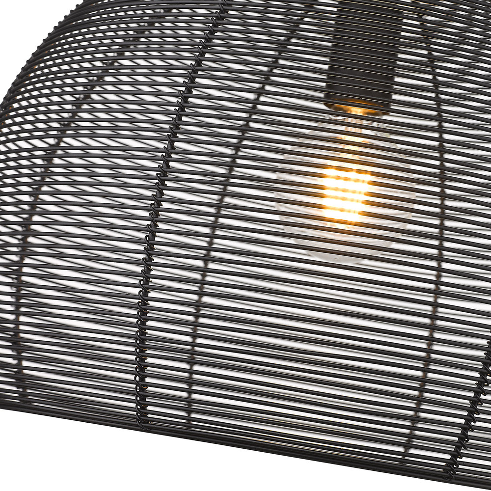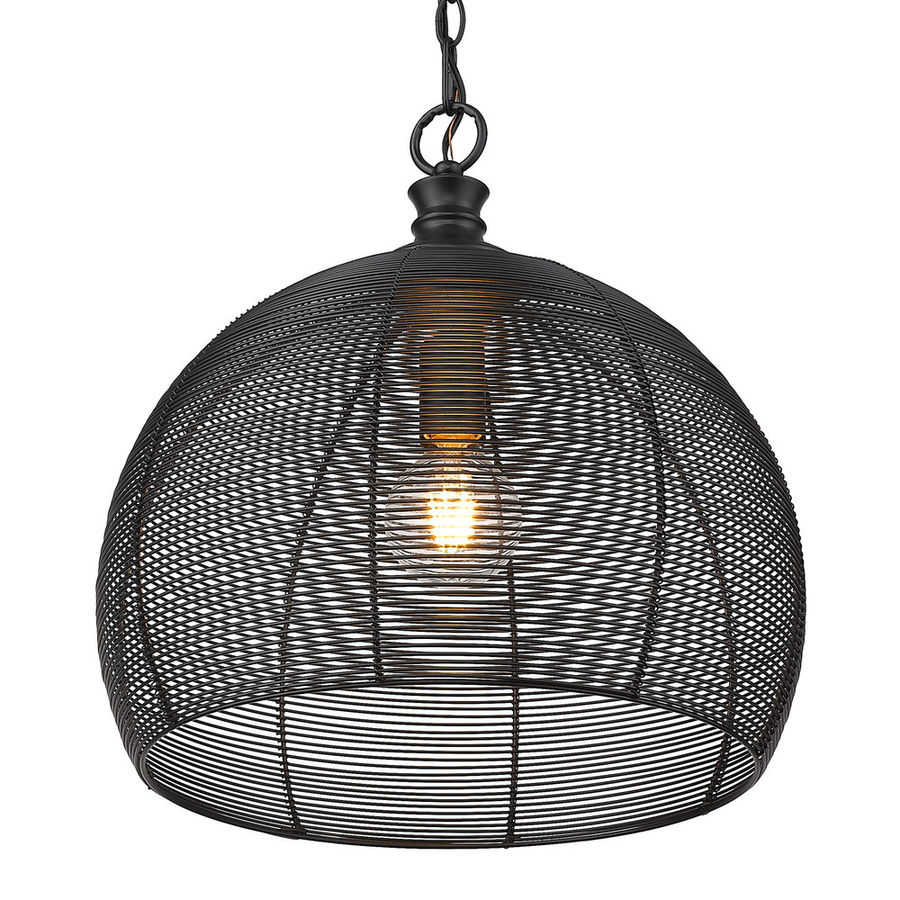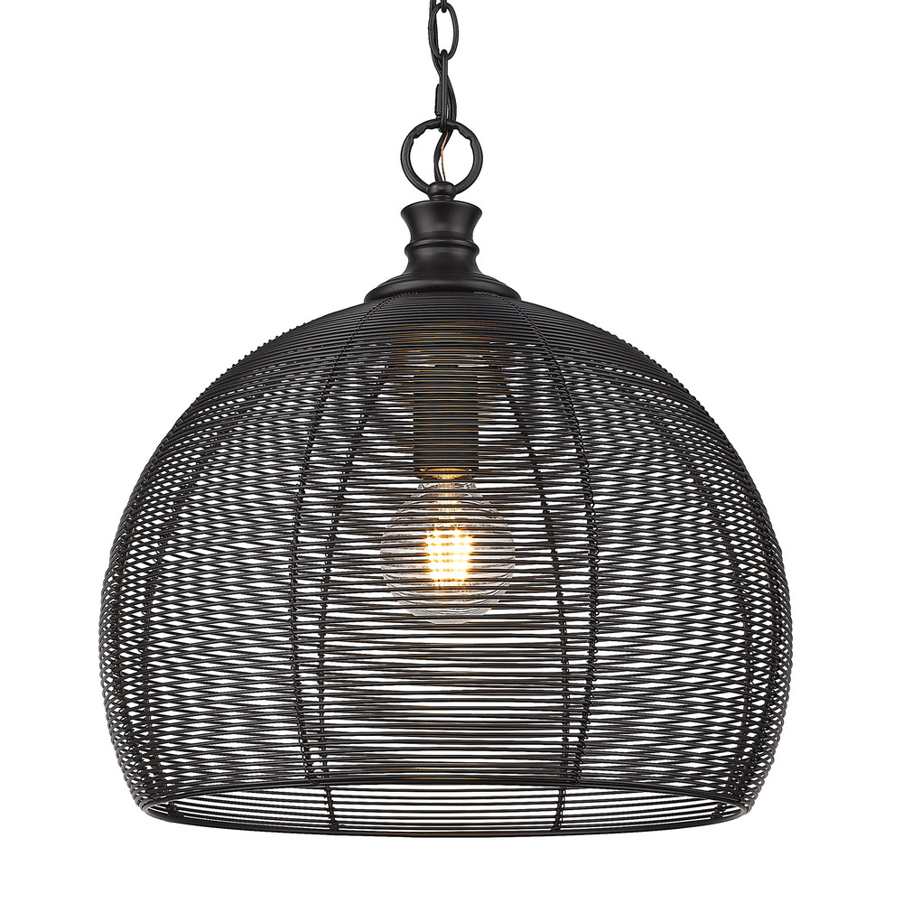 Bring industrial elegance into your home with the Golden Lighting Calypso 1-light 16in Pendant in Matte Black. Featuring a metal shade and a matte black frame, it creates a welcoming atmosphere. The full wire mesh cage design showcases a chic, textural industrial look, celebrating the raw beauty of exposed bulbs and casting a warm glow. The matte black finish is timeless, versatile, and offers a sophisticated look that complements a range of decor styles. This pendant light is suitable for damp locations, perfect for covered porches or bathrooms. With its adjustable height feature, it can be customized to fit your space, and its overall dimensions are 15.75"W x 16.38"H x 15.75"D. Requires 1 E26 medium base bulb, max 100 watts (bulb not included). Elevate your home with this stylish and impactful piece that blends functionality with quality.