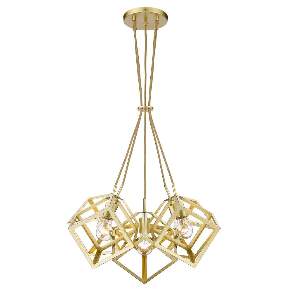 Experience the allure of modern sophistication with the Golden Lighting Cassio 5-light Chandelier in Olympic Gold. This exquisite pendant light showcases a stunning open-frame design with five exposed bulbs, creating an inviting glow for dining rooms and elegant living areas. The Olympic Gold finish provides a soft, pale gold hue that diffuses light beautifully, offering a touch of warmth without the glare of high shine. Its refined matte surface adds a contemporary sensibility, enhancing the structural beauty of the piece. Designed for dry locations, this chandelier is sloped-ceiling compatible and features an adjustable height ranging from 36" to 123" for custom installation. Overall dimensions are 27.88"W x 19"H x 27.88"D, with a requirement of 5 E26 medium base bulbs (not included) at a maximum wattage of 60 per bulb. Elevate your home’s atmosphere with this striking, high-quality lighting fixture.