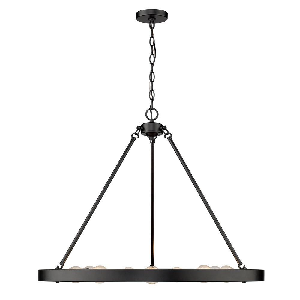 Elevate your home with the stunning Golden Lighting Castile 9-light Chandelier. Its low-profile design captures modern elegance, creating a welcoming atmosphere in your dining room or foyer. Without a shade, this piece showcases its beautiful structure and emits ample light, illuminating your space with sophistication. It’s designed for versatility and can easily enhance any decor style with its classic silhouette. The matte black finish provides a smooth, non-reflective surface that absorbs light beautifully and adds an understated elegance to your environment. Designed for damp locations, it works well in areas with occasional moisture, providing an added layer of utility and functionality. This chandelier is sloped-ceiling compatible and features adjustable height settings, ranging from 28.25" to 97.625". Its overall dimensions are 32"W x 24.75"H x 32"D, and it requires 9 E26 Medium base bulbs (not included), making it an ideal centerpiece for any living space.