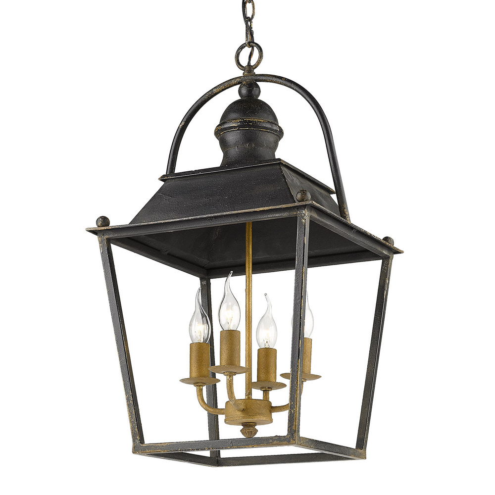 Bring refined sophistication into your home with the Golden Lighting Christoff 4-light Pendant. Featuring an antique black iron finish, it creates a welcoming atmosphere. This luminous fixture features a classic lantern silhouette without a shade, beautifully illuminating spaces while showcasing the rugged texture of the antique black iron finish. The artisan-crafted surface reflects a timeless style that's perfect for any decor. Ideal for dry locations, it suits areas not exposed to moisture, such as bedrooms, living rooms, and hallways. This pendant is sloped-ceiling compatible with adjustable heights from 28.875" to 100.875" offering versatility for various room layouts. Overall Dimensions: 14.63"W x 25.88"H x 14.63"D. Requires 4 E12 Candelabra base bulbs (not included), max wattage 60 per bulb. Illuminate your living space with this exquisite pendant, perfect for creating a cozy, elegant atmosphere in any home.