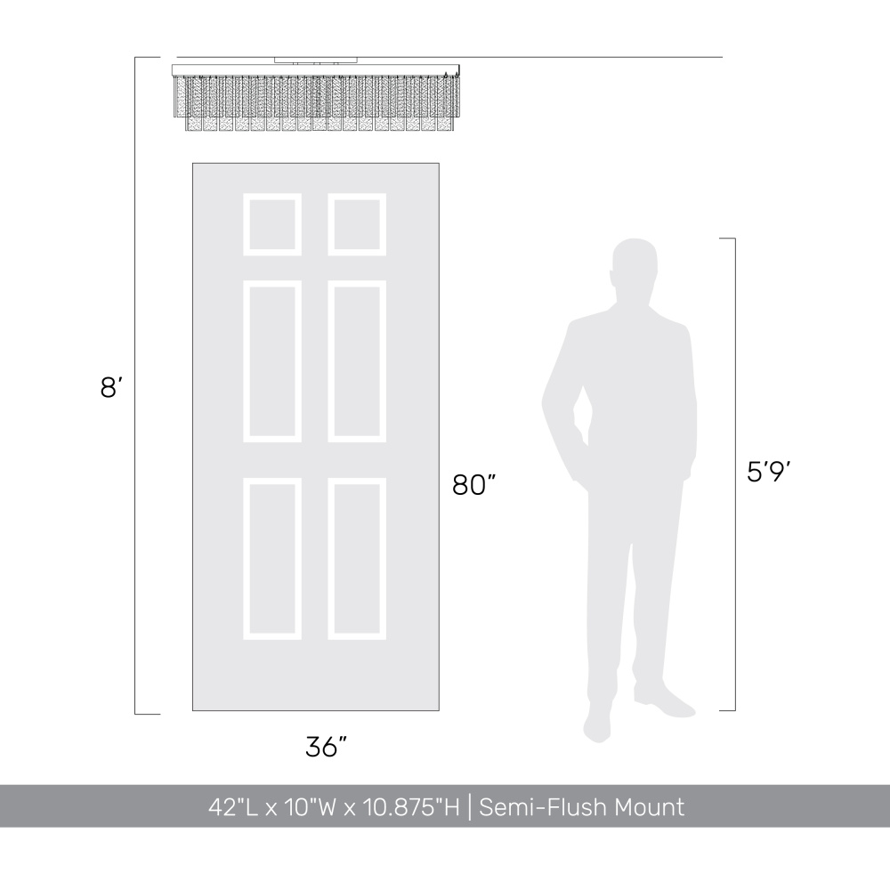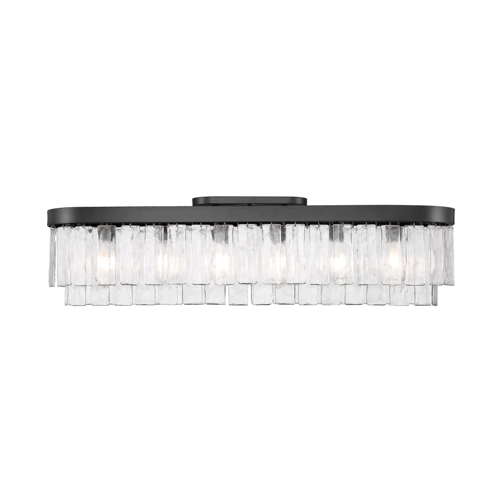 Introduce contemporary sophistication into your home with the Golden Lighting Ciara 6-light Flush Mount. Featuring beautifully crafted glass shades and a striking Matte Black frame, it creates an inviting ambiance. The hammered water glass showcases a unique texture that refracts light artistically, enhancing the elegance of this fixture. The Matte Black finish is non-reflective and complements various decor styles, from minimalist to bold contemporary. Perfect for low ceilings in hallways, closets, laundry areas, bathrooms, and more, this fixture is damp location rated for safety. It offers convertible installation options and is fully adjustable to fit your space. With dimensions of 42"W x 10.88"H x 10"D, this fixture requires 6 E26 medium base bulbs (not included), max 60 wattage each. The Ciara collection delivers quality craftsmanship and style, making it a fantastic addition to your home.