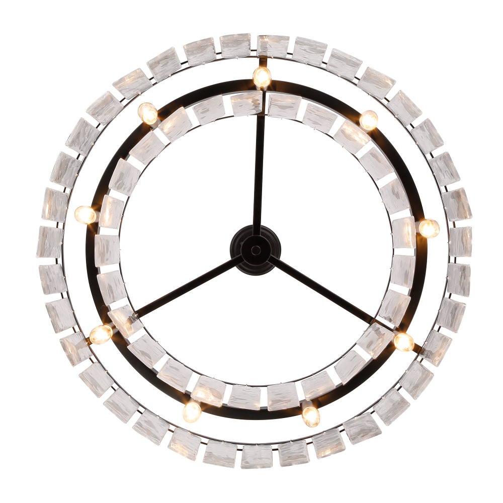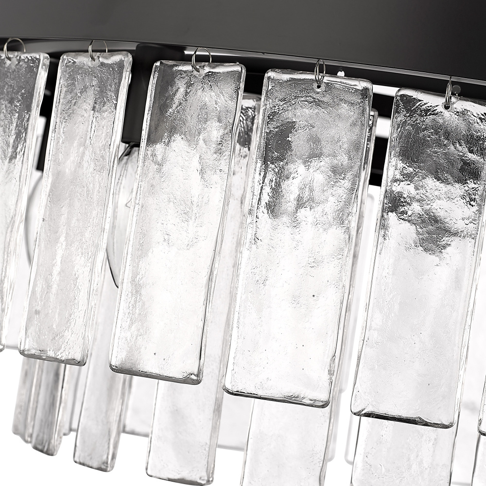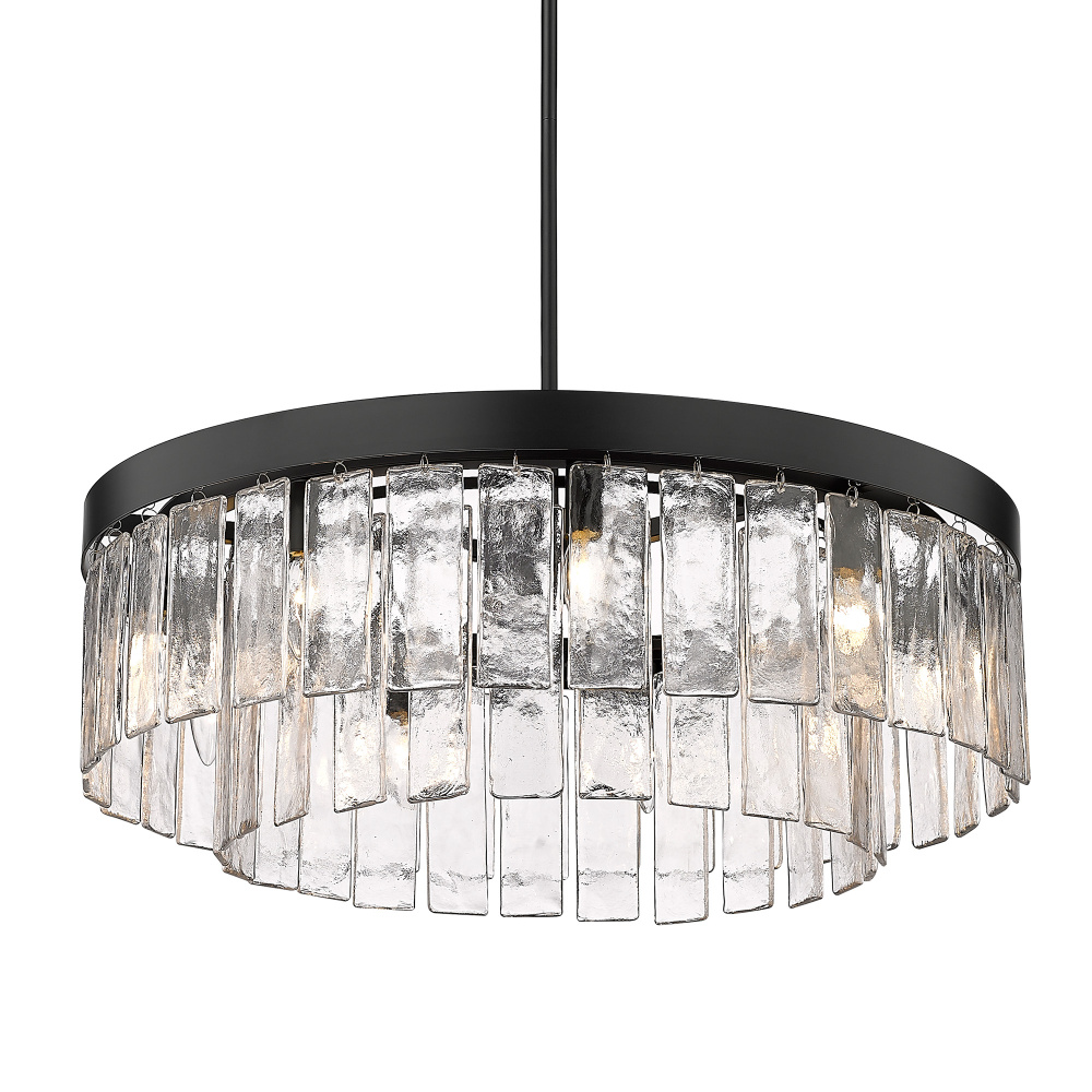 Bring glam elegance into your home with the Golden Lighting Ciara 9-light Chandelier. Featuring a glass shade and a Matte Black frame, it creates a welcoming atmosphere. The glass shade features a Hammered Water Glass, which boasts a heavy, irregular texture designed to create a beautifully distorted and refractive light effect. This artisanal choice captures the essence of both ice and water, offering a dazzling glow that animates any space. The Matte Black finish is the epitome of modern design, with its deep, non-reflective surface that complements various decors, from minimalist to contemporary. Perfect for dining rooms and foyers, this chandelier is Damp Location Rated, making it suitable for covered or semi-enclosed spaces. The Convertible Design allows for easy installation as either a semi-flush mount or pendant, with an Adjustable Height from 10.125" to 55". Overall Dimensions: 27"W x 10.13"H x 27"D. Requires 9 E12 Candelabra base bulbs (not included) with a maximum wattage of 60 per bulb. Make a dramatic statement with a fixture that's as engaging as it is elegant, crafted with artistry and quality.