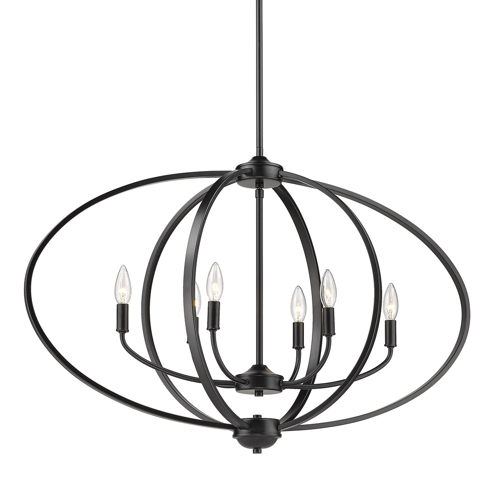 Bring Modern elegance into your home with the Golden Lighting Colson 6-light Island Light in Matte Black. This striking fixture brings utility and flair to kitchen islands or dining areas. Sporting a clean, open-orb frame, this suspended light features a timeless candelabra design that creates a sophisticated statement piece. The Matte Black finish is smooth to the touch, adding a refined elegance to your décor. Rated for dry locations, it is perfect for indoor spaces like bedrooms and living rooms. The adjustable height feature allows for a minimum hanging length of 25.875" and a maximum of 67.875", accommodating various ceiling heights. Overall dimensions are 35"W x 23.25"H x 13"D, and it requires 6 E12 Candelabra base bulbs (not included), with a maximum wattage of 60 per bulb. Elevate your home with this remarkable island light, combining modern style with functional lighting to effortlessly illuminate your gatherings.