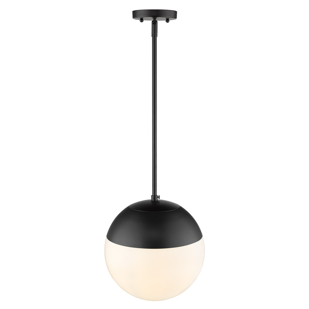 Bring clean modern style into your home with the Golden Lighting Dixon 1-light 12in Pendant and Matte Black. Featuring a glass shade and an eye-catching Matte Black frame, it creates a sophisticated atmosphere. The glass shade enhances the light quality while completing the sleek look of the pendant. The Matte Black finish offers a smooth surface with deep, uniform color, providing a timeless design that fits with any decor. Ideal for kitchens, dining rooms, or bedrooms, this pendant light is Damp Location Rated, suitable for areas with occasional moisture. Installation is easy on sloped ceilings, and it has an adjustable height range of 20.375" to 56.375". Overall Dimensions: 11.75"W x 17.75"H x 11.75"D, requiring 1 E26 Medium base bulb (max 100W, not included). Experience the blend of design and functionality with this stylish pendant light.
