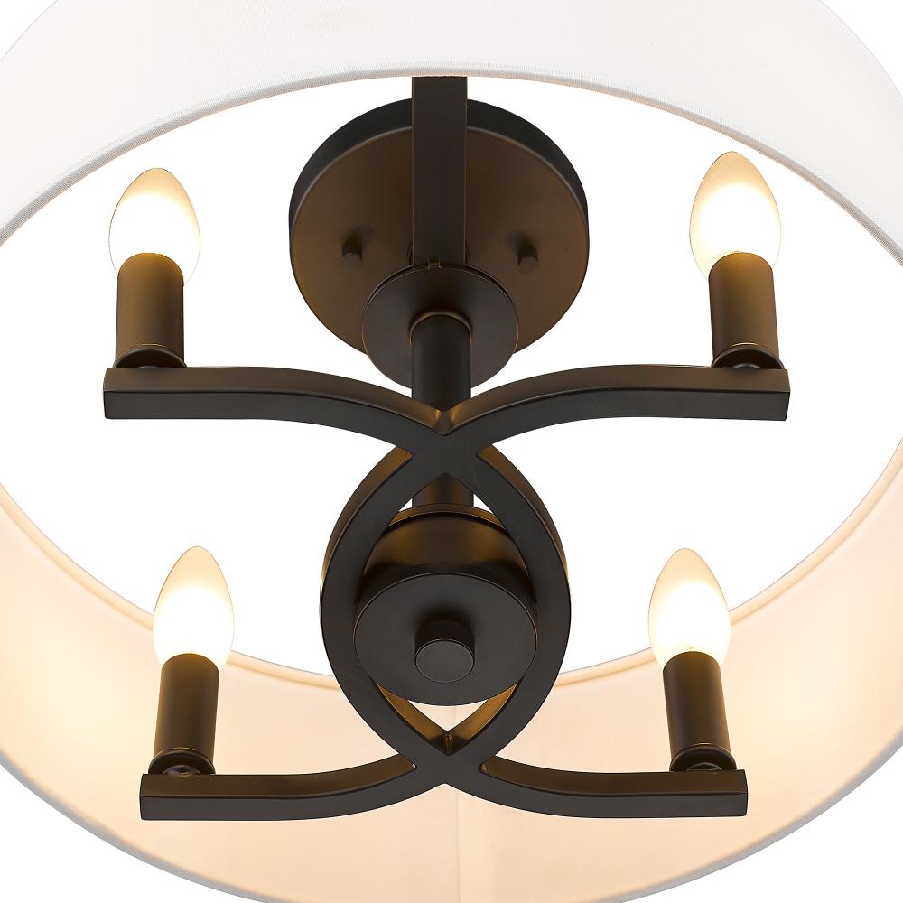 Bring a touch of industrial elegance into your home with the Golden Lighting Eliana 4-light Semi-Flush Mount in Matte Black. This striking fixture merges a soft fabric shade with a clean, contemporary frame, making it a perfect choice for various decor styles. The modern white fabric shade encircles the candelabra base, delivering a soft and diffused glow that creates a welcoming atmosphere. Its Matte Black finish enhances the overall aesthetic, offering a smooth, non-reflective quality that seamlessly blends with minimalistic to bold interiors. Damp location rated for versatility, the Eliana is suitable for covered areas including entryways, kitchens, and living rooms. Overall Dimensions: 15.5"W x 10.13"H x 15.5"D. Requires 4 E12 Candelabra base bulbs (not included), max 60 watts each, to illuminate your space beautifully. Elevate your home lighting with the Golden Lighting Eliana, it's the ideal fusion of style and practicality.