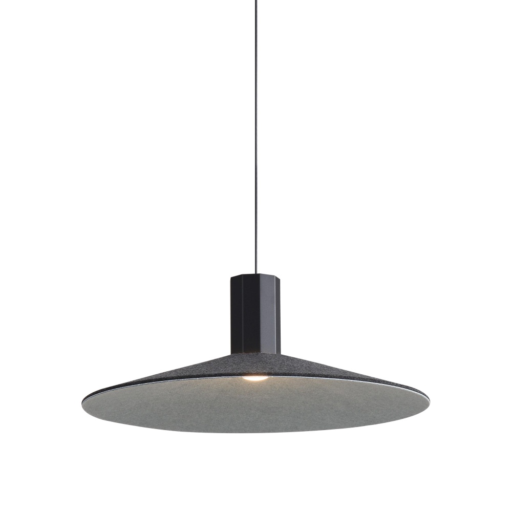 Discover modern sophistication with the Golden Lighting Faroe 20in Integrated LED Pendant. This stunning fixture showcases a felt shade and a Matte Black frame, creating an inviting atmosphere. The dual-toned felt shade, featuring a rich dark flecked black exterior and a gray interior, beautifully diffuses light while providing sound-dampening effects, making it an excellent choice for enhancing room acoustics. Complementing its contemporary design, the Matte Black finish offers a timeless and versatile look that blends seamlessly with various decor styles. This pendant is perfect for kitchens, dining rooms, and bedrooms and is Dry Location Rated, making it ideal for indoor spaces. With Sloped-Ceiling Compatibility and adjustable height, it adapts effortlessly to your space requirements. Measuring 19.5"W x 7.38"H x 19.5"D, this fixture provides 610 rated lumens through energy-efficient integrated LED technology, casting a warm 3000K glow. Enhance your living environment with this modern lighting fixture, providing both elegance and function.