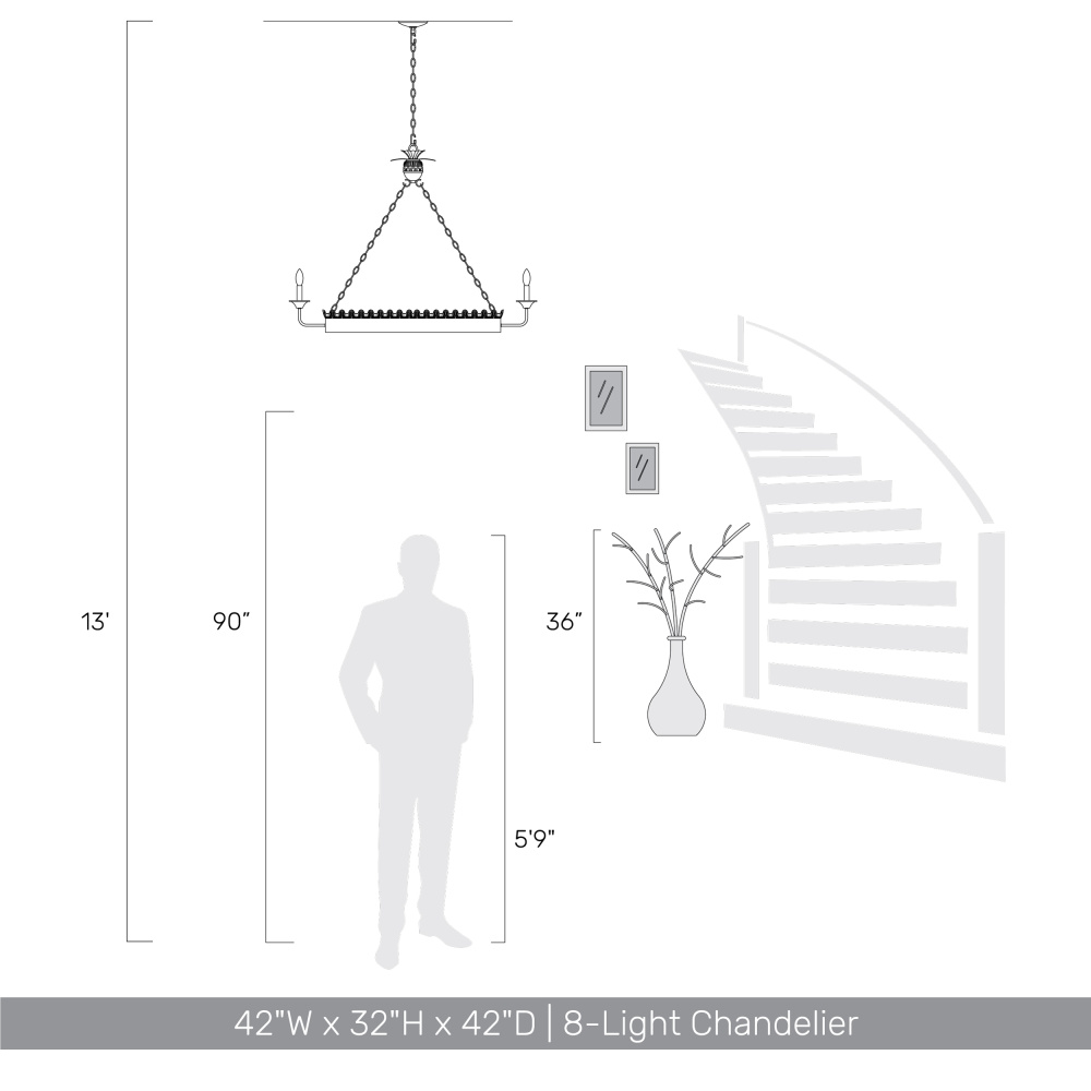 Bring classic grandeur into your home with the Golden Lighting Finley 8-light Chandelier in Vintage Sage. This magnificent chandelier not only illuminates your spaces with an inviting glow but also serves as an architectural statement piece. With no shades to hinder the light flow, the chandelier showcases its alluring structure and vintage sage finish, which embodies the romantic character of a European heirloom. Perfect for dining rooms and entryways, this chandelier invites admiration and attention while remaining dry location rated for versatile indoor placement. Install this showstopper on angled ceilings with ease, thanks to its adjustable height feature, ranging from 35.125" to 108.875". Its overall dimensions are 42"W x 32"H x 42"D, and it requires 8 E12 candelabra base bulbs (not included), allowing for a maximum wattage of 60 watts per bulb. Transform your interiors with the Finley Chandelier, a hallmark of elegance and craftsmanship in any traditional setting.