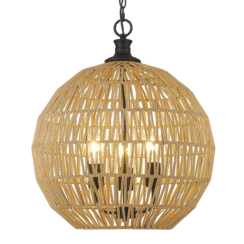 Bring Boho elegance into your home with the Golden Lighting Florence 3-light Pendant in Matte Black. Featuring a rope shade and a matte black frame, it creates a welcoming atmosphere. The natural raphia rope shade brings a breezy, coastal feel to any space, with its hand-woven construction and interplay of light and shadow. The finish is the epitome of clean, modern style, its deep, uniform black color adds sophistication and versatility, complementing various décor. Ideal for dry locations, this pendant is perfect for indoor spaces like bedrooms and living rooms. It's sloped-ceiling compatible, with an adjustable height of 25.125" to 97.125". Overall dimensions are 18.5"W x 21.63"H x 18.5"D, and it requires 3 E26 medium base bulbs (not included) with a maximum wattage of 60 per bulb. Elevate your home's aesthetic with this versatile and stylish lighting fixture.